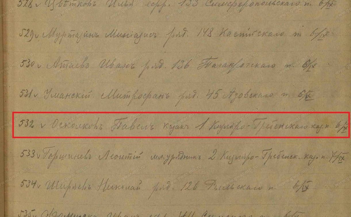 Каз. Павел Яковлевич Асколков, 1-го Кизляро-Гребенского полка, ст.Романовской, старообр., жен., ранен в авг. 1916 г.