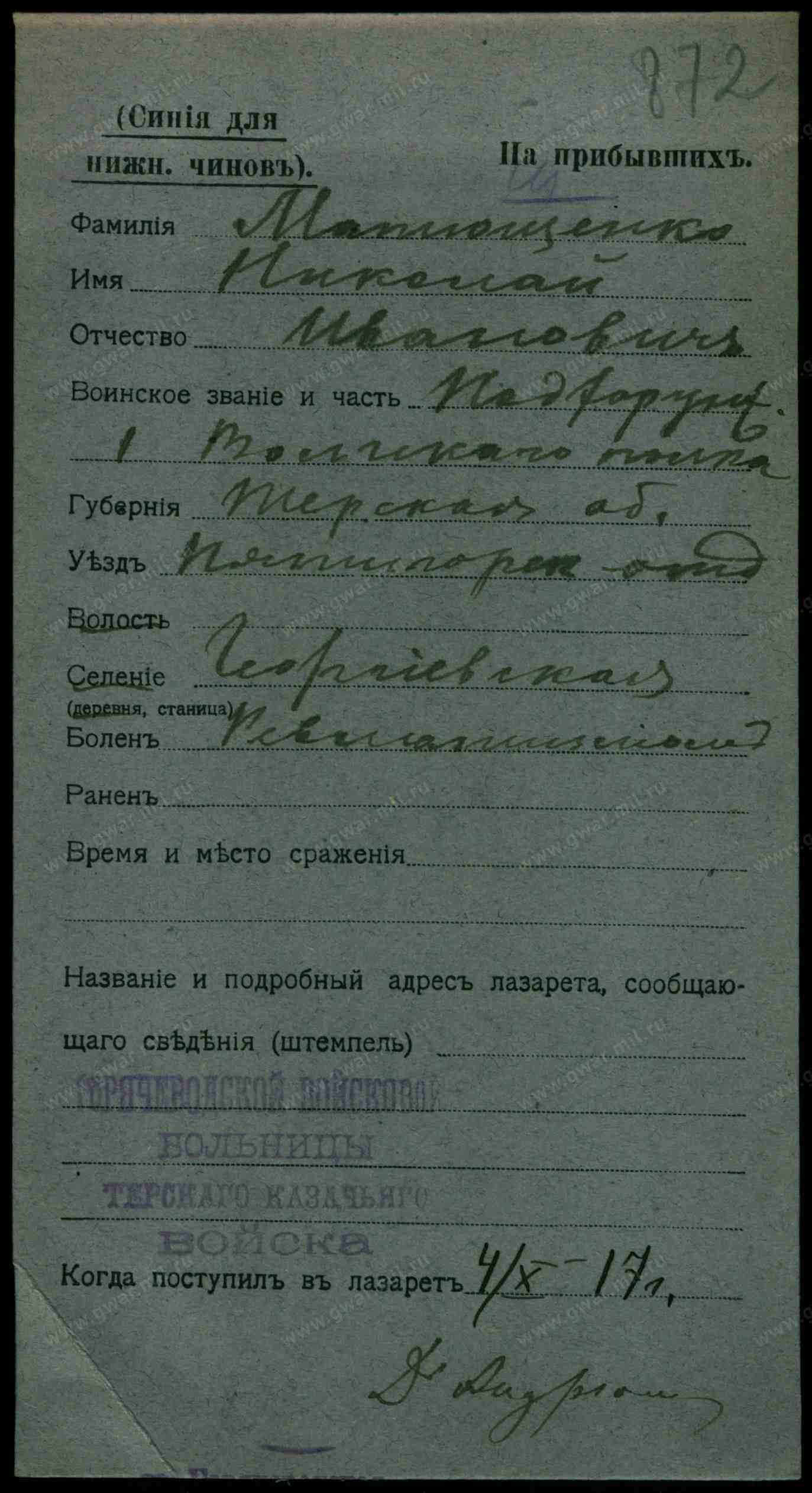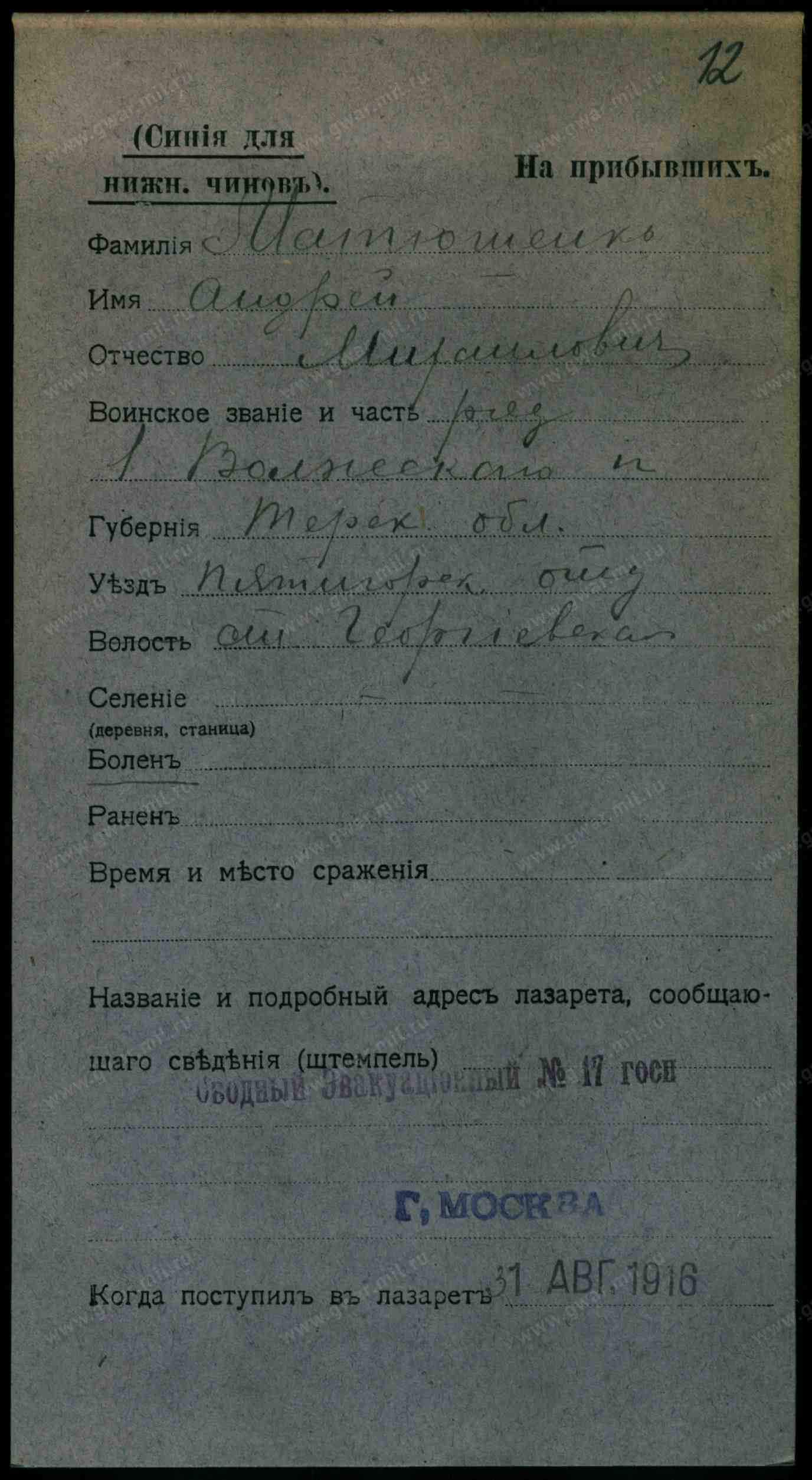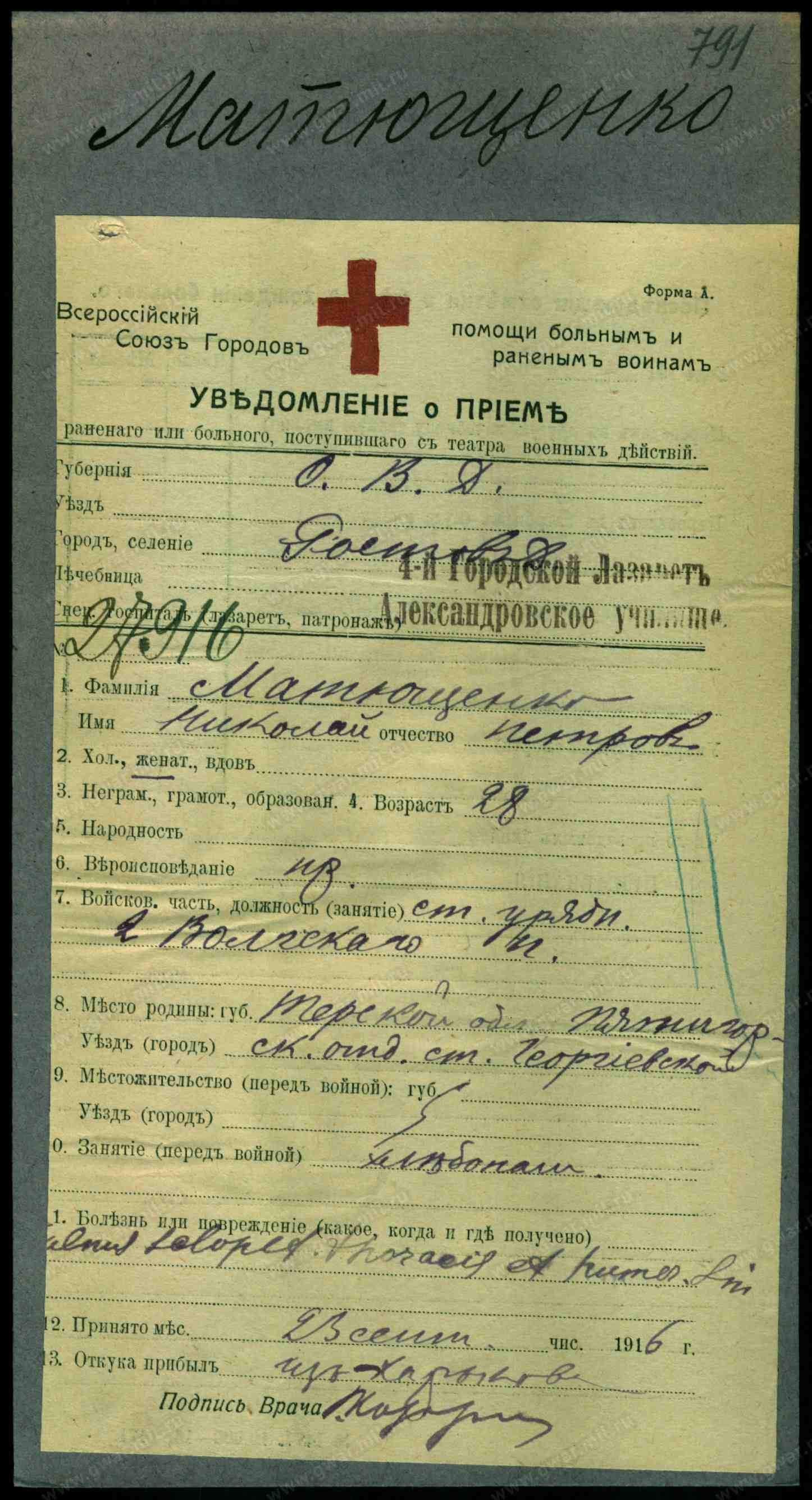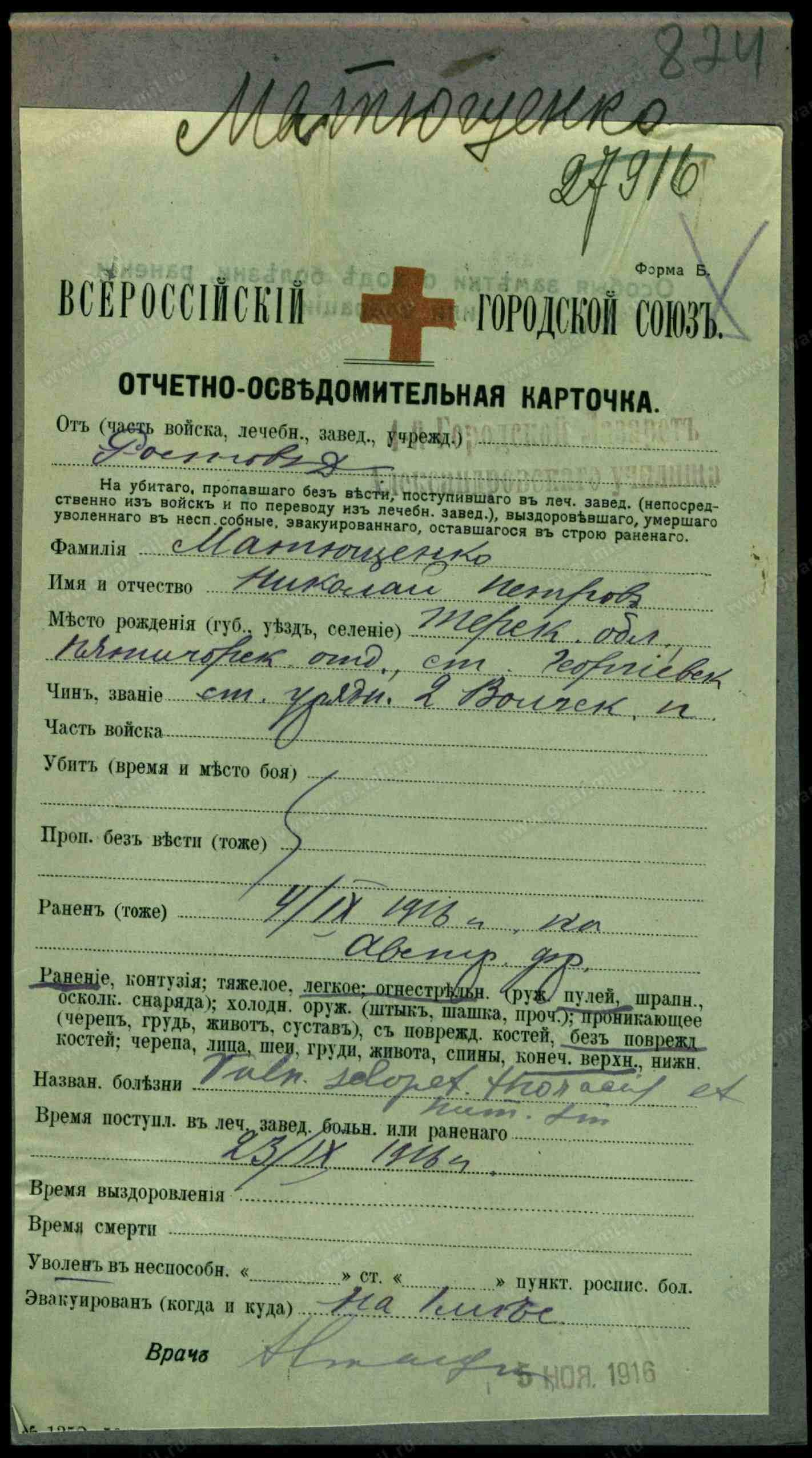 МАТЮЩЕНКО Николай — 2 Волгский каз. полк, ст. урядник. За оказанные подвиги мужества и храбрости, проявленные в боях с австрийцами при занятии г. Черновицы, 3.06.1916.