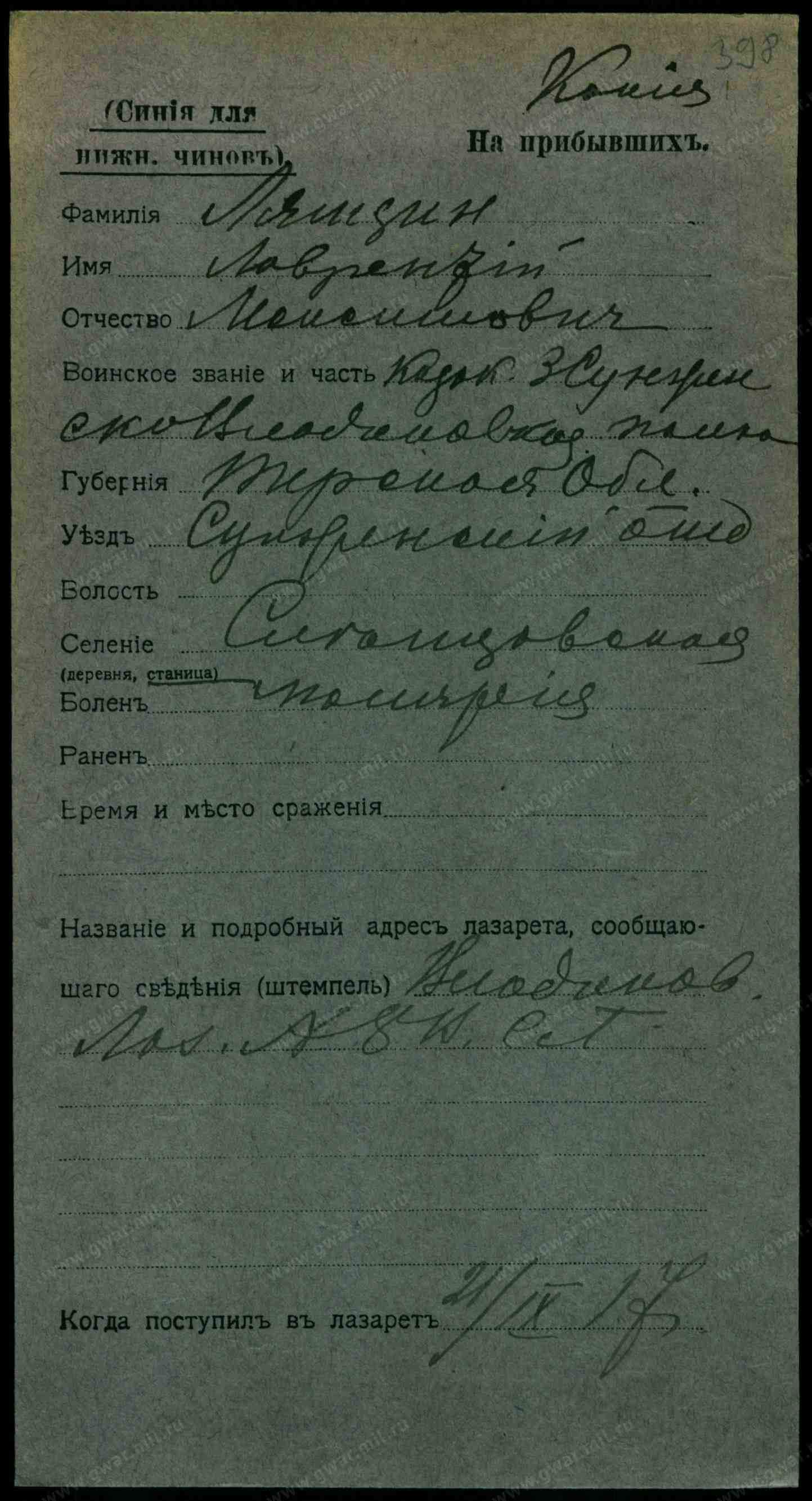 Мл. ур. Лямзин Иван Федорович, 1-й Терский пеший бат., правос., женат, ст. Слепцовская Сунженского отд. Терской обл., умер от ран 17 июля 1916 у сел. Мазраа.