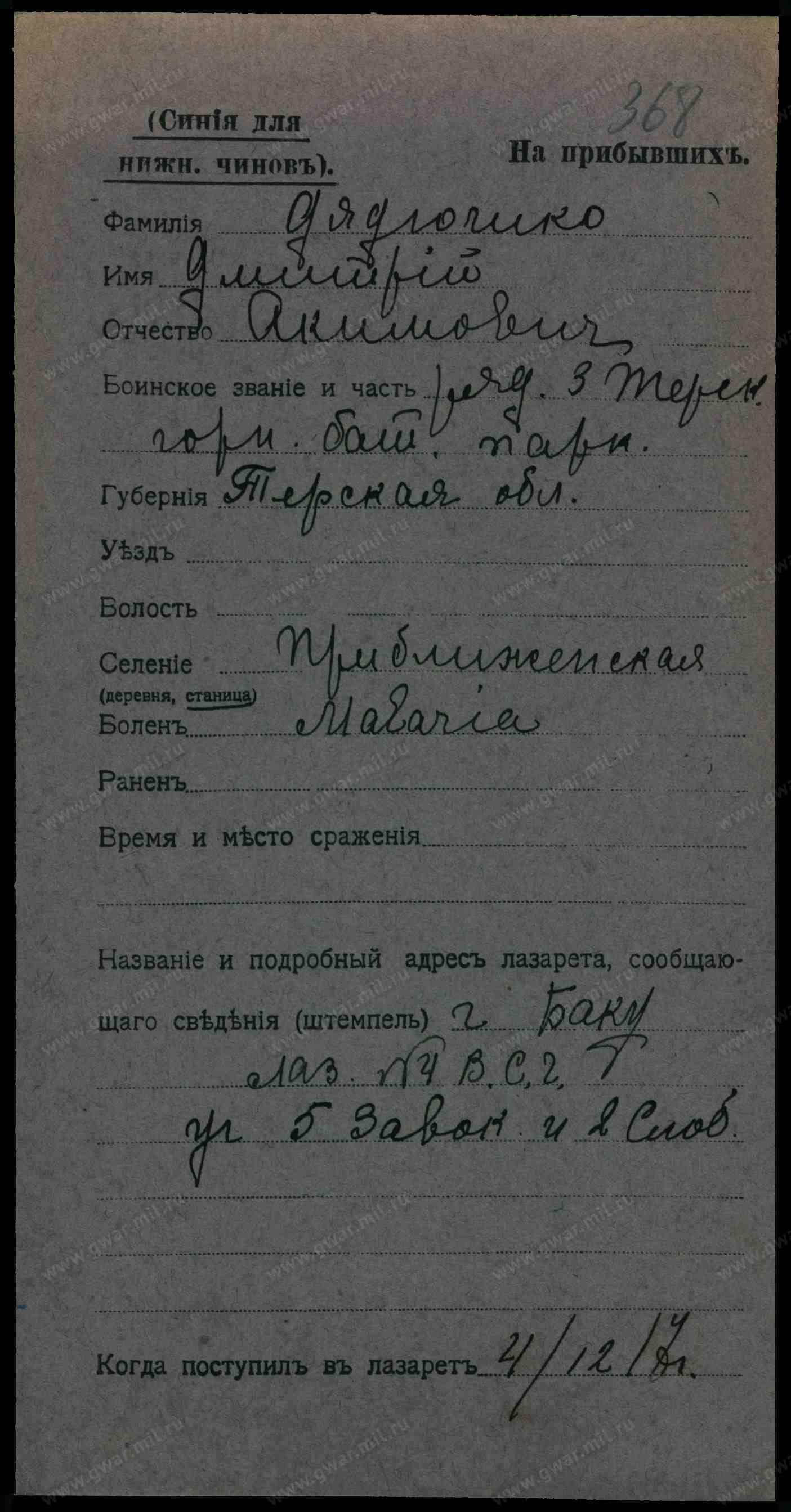 Нижепоименованные нижние чины за боевые отличия награждены мною Георгиевскими крестами 4-й степени...Мл. урядник Никифор Дедюшко – No 851396 (Ст. Приближная).
