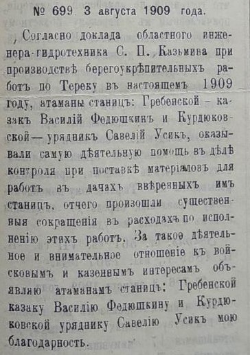 Объявление благодарности атаманам станицы Гребенской казаку Василию Федюшкину и станицы Курдюковской уряднику Савелию Усик за помощь в контроле поставки материалов при производстве берегоукрепительных работ по Тереку.