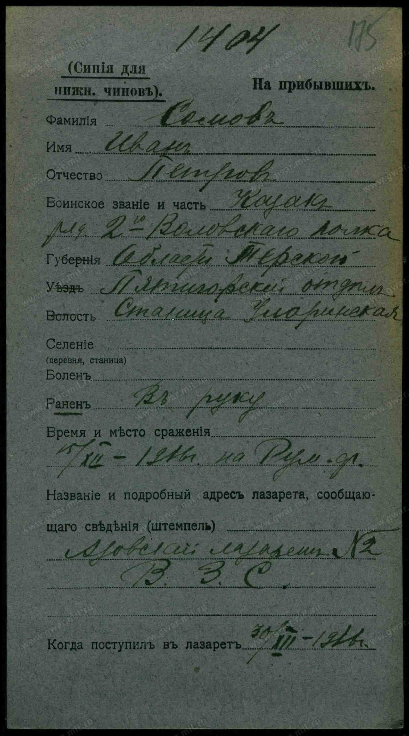 Станицы Марьинской Николай Сомов/ в 1-й В полк/ обучается во Владикавказском военном госпитале