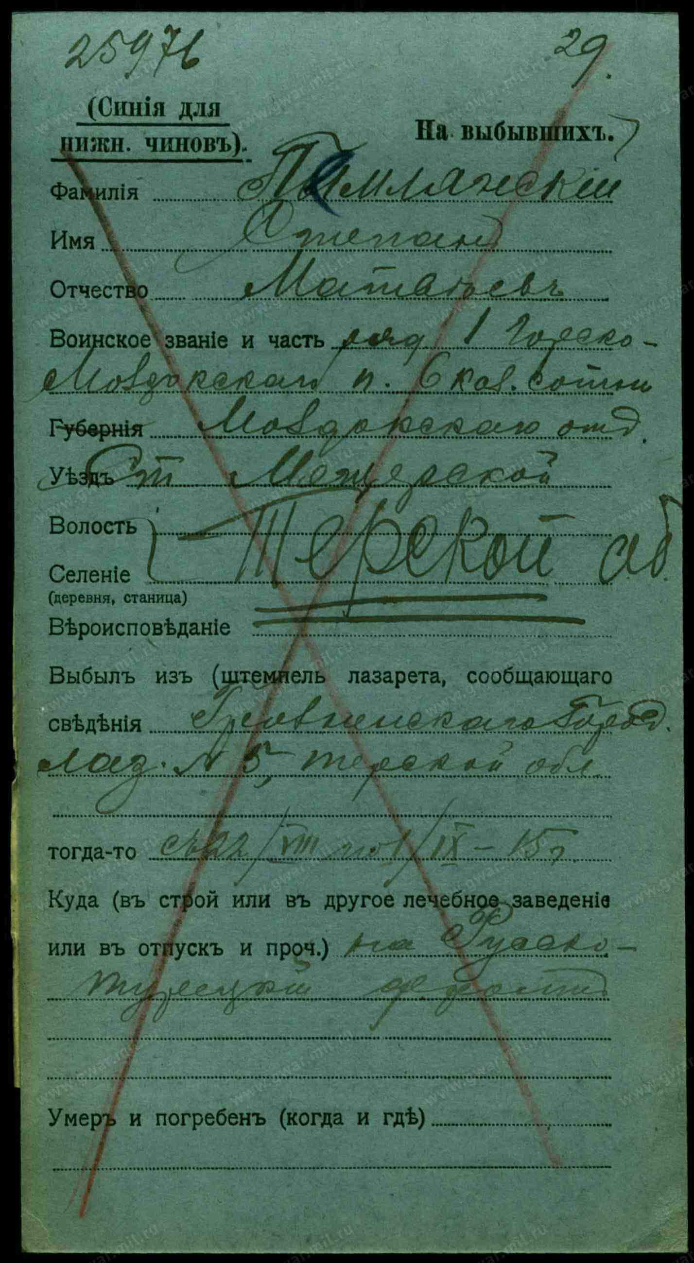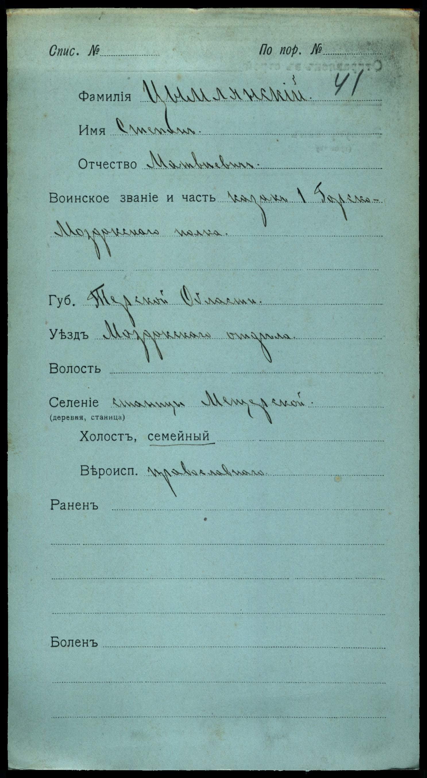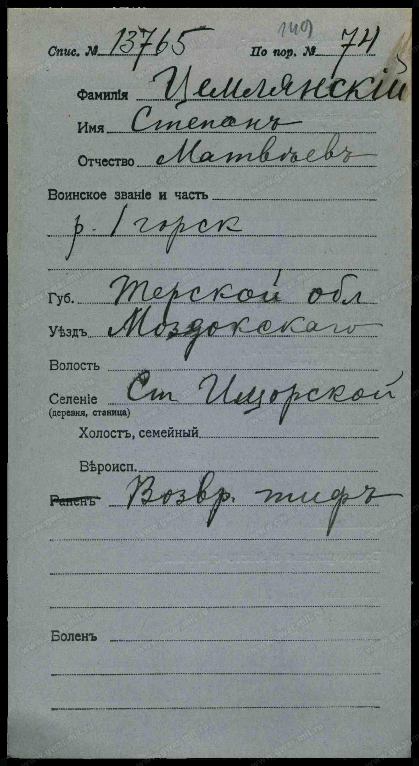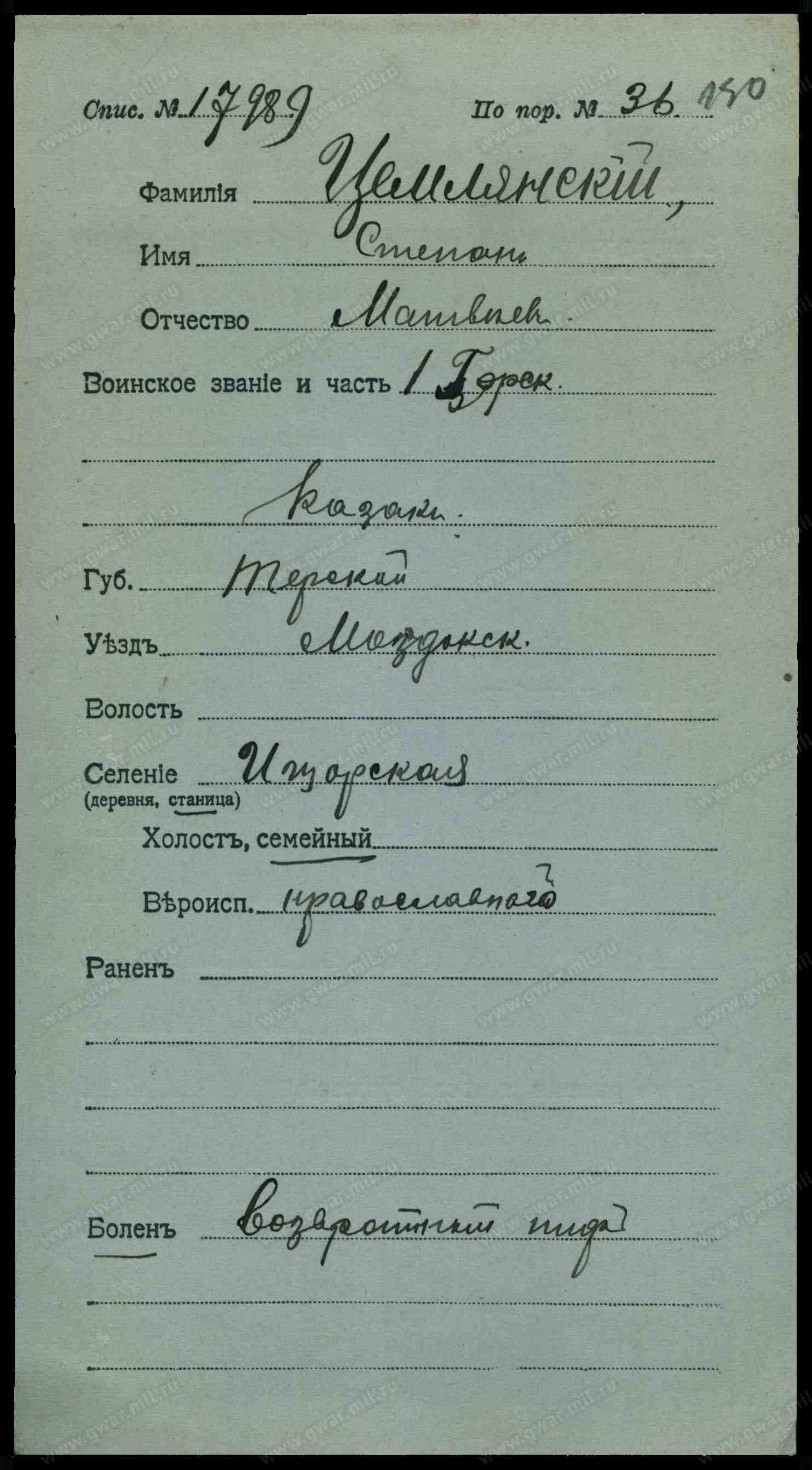 Лейтенант. __.__.1914 Грозненская обл., Наурский р-н, ст. Ишерская. Сводная картотека
