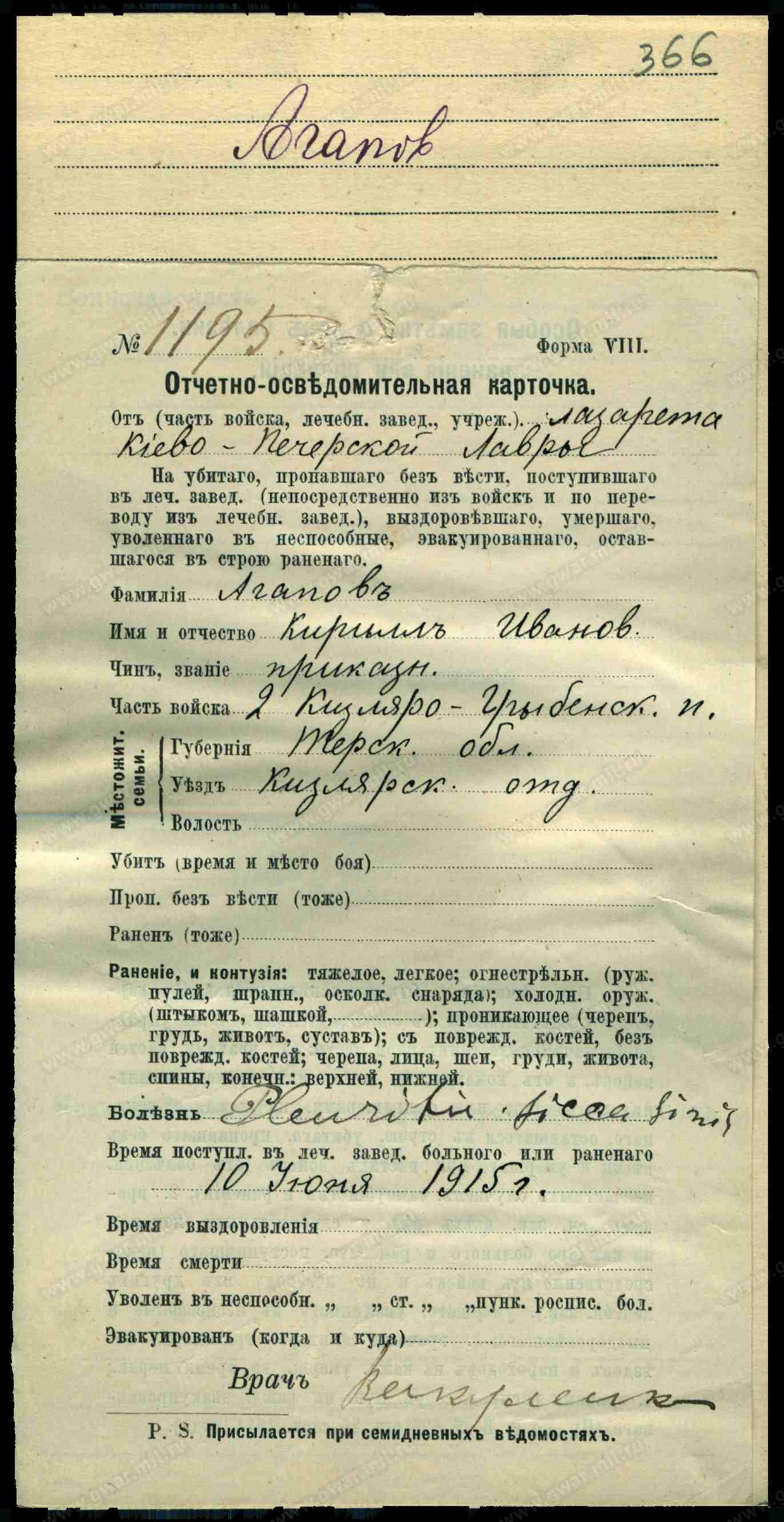 Каз. Агапов Кирилл Николаевич, 2 сотня, правос., жен., ст. Савельевской Терской обл. Кизлярского отд., ранен 26 сент. 1915 г., с. Соколово, отправлен м. Трембовля.