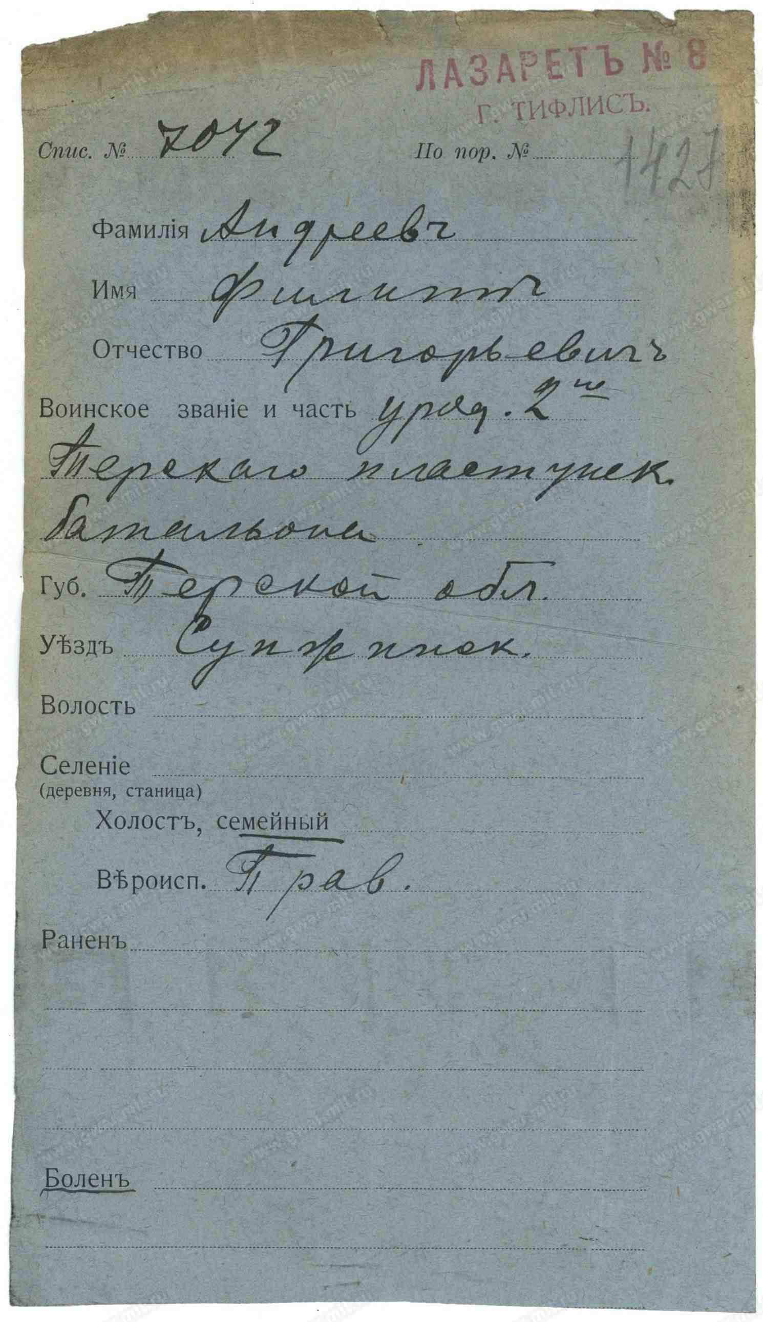 Список воинских чинов 1-го Сунженско-Владикавказского Генерала Слепцова полка убитых, пропавших без вести и взятых в плен неприятелем а так же раненных и контуженных с начала открытия военных действий против Турции по Январь 1917 года. Архив Краснодарского края Ф 437 оп 1 Д 57