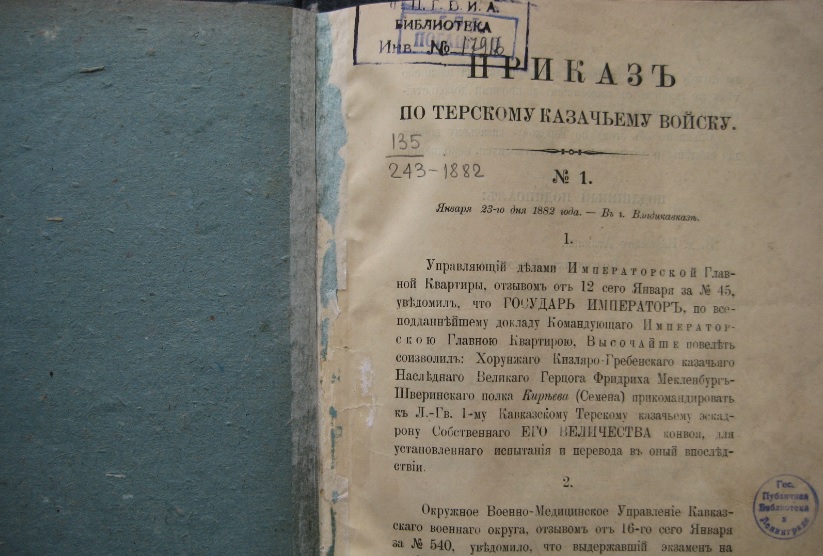 Источник: Приказ по ТКВ № 11 от 23 февр. 1882 г. Владикавказ
