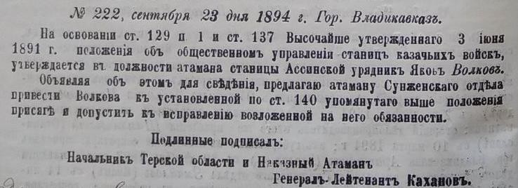 31 янв. 1888. Атаман ст. Ассинской Сунж. отд. урядник Ефим Фарафонов уволен от должности, а вместо него утвержден атаманом урядник Матвей Климов и кандидатом к нему урядник Федор Леснов.