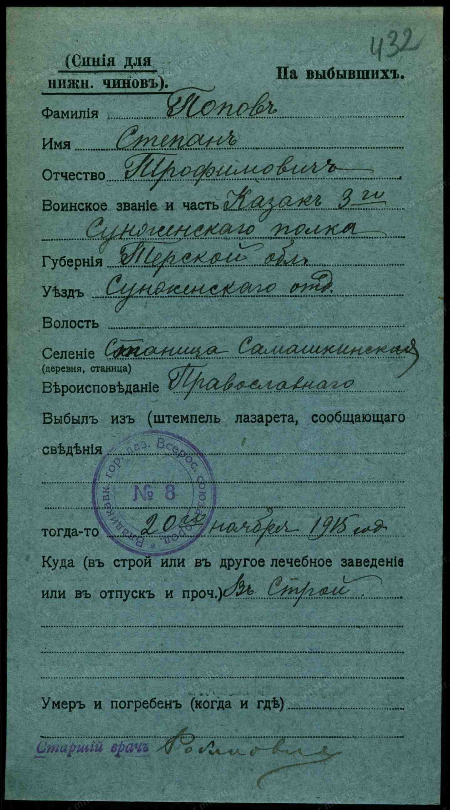 Восприемники: Урядник 1-го Сунженско-Владикавказского Генерала Слепцова полка Терского казачьего войска, казак станицы Терской Сунженского отдела Терской области, Сергей Семенов Лынов и жена казака того же полка станицы Самашкинской Сунженского отдела Терской области Степана Васильева Попова Мария Моисеева Попова.