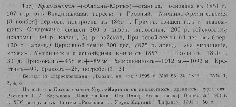9 окт. 1911 г. состоялось освящение во имя Михаила Архангела оконченного постройкой нового православного храма в станице Ермоловской. Освящение совершал с разрешения епископа Владикавказского Агапита (Антоний Иосифович Вишневский) викарный епископ Пятигорский Арсений (Александр Иванович Смоленец) в сослужении священников ближайших станиц и городов Владикавказа и Грозного.