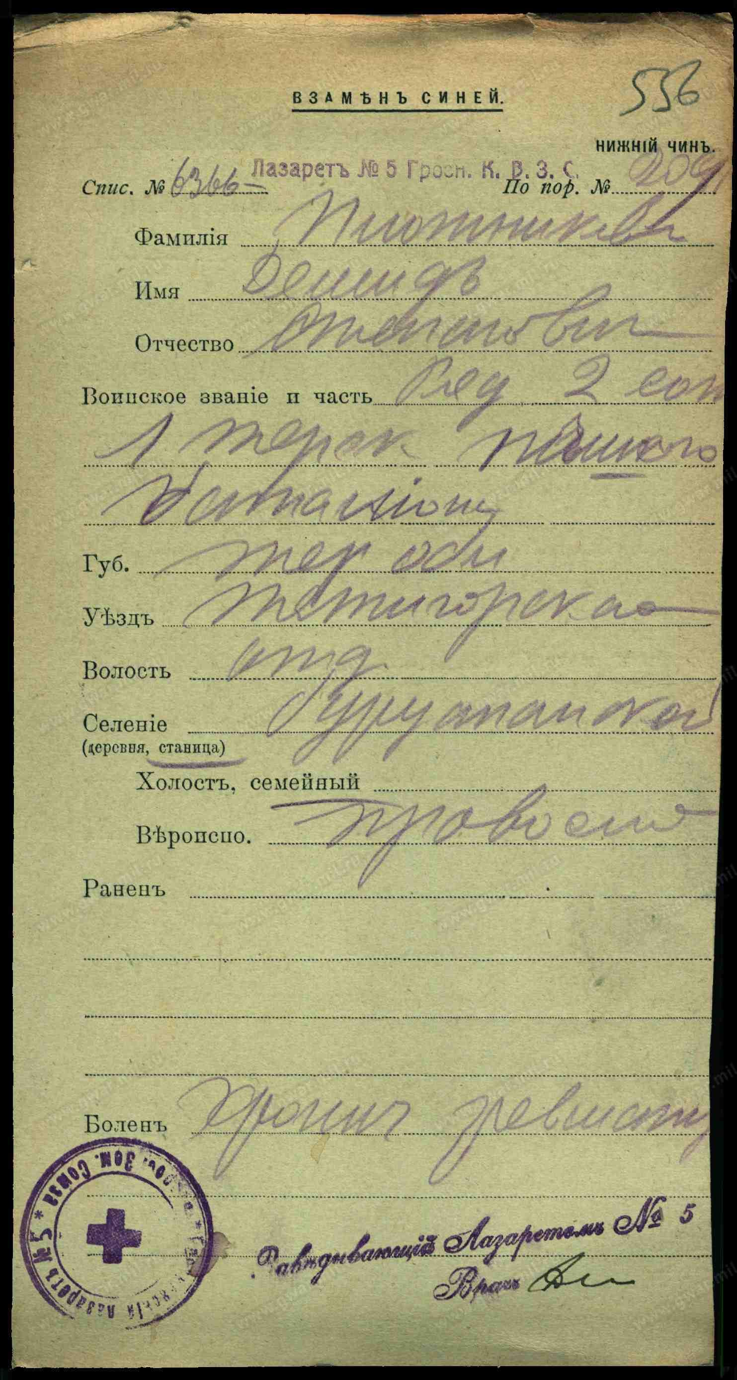 Место рождения Терская обл., Пятигорский отдел, стнц. Березанская
