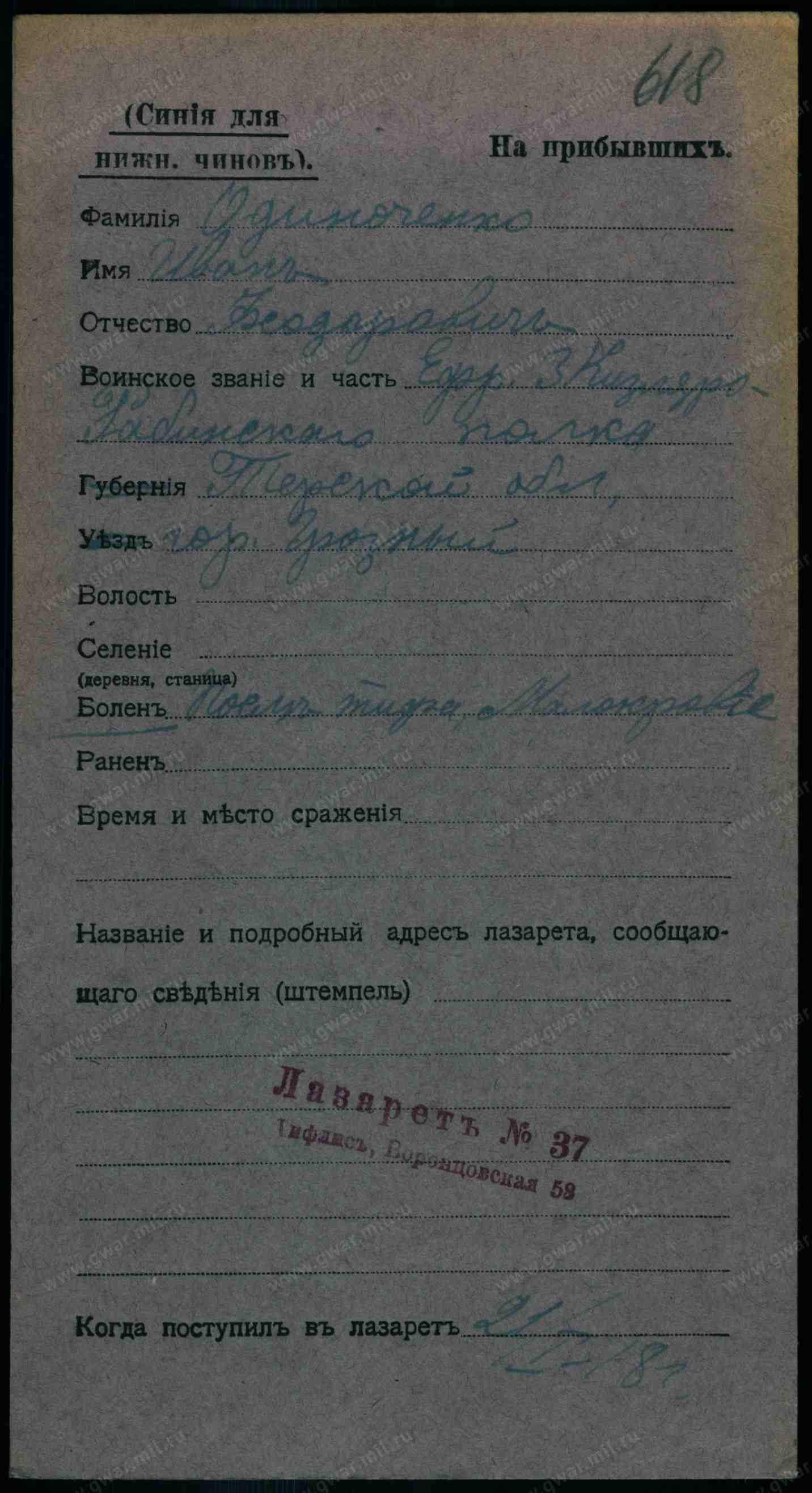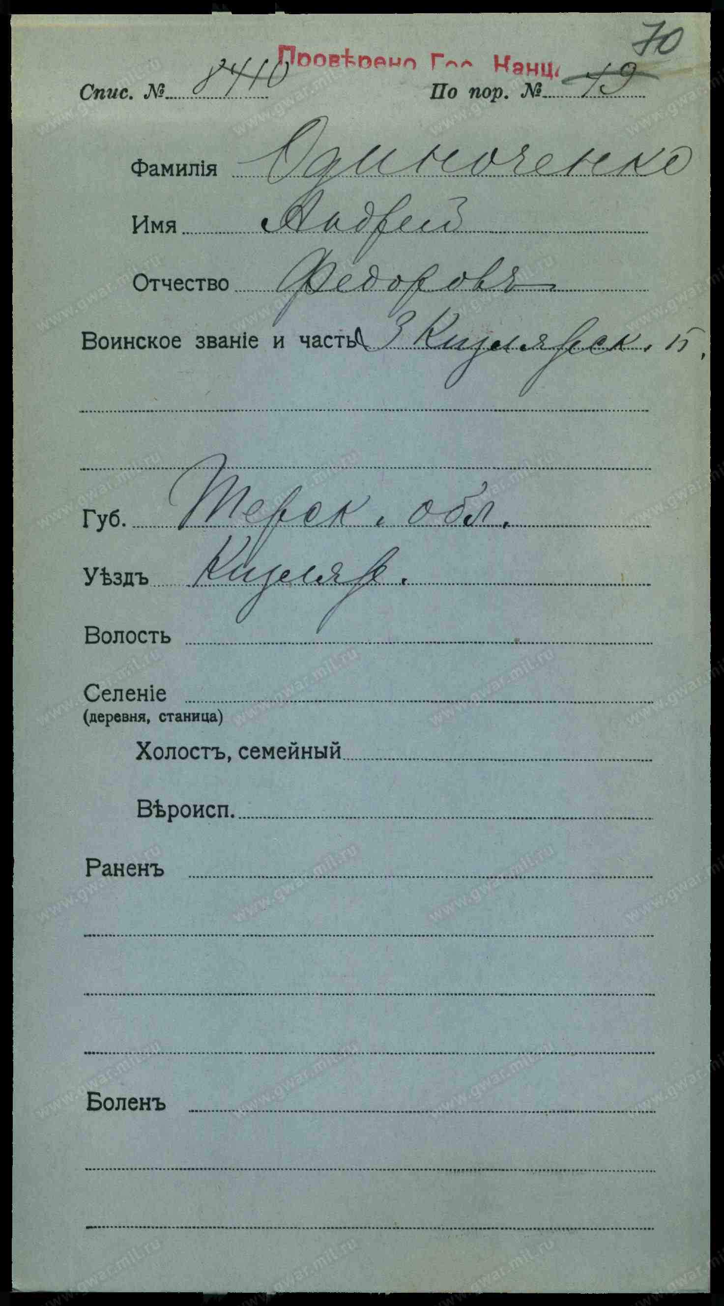 Жена Одиноченко Прасковья Ивановна, г. Грозный ул. 1-я Советская 38.
