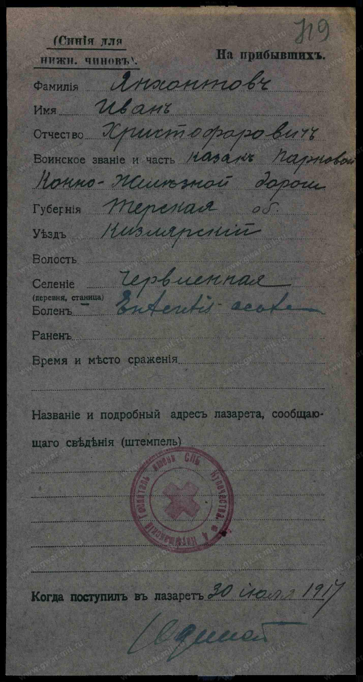 Ст. ур. Янхотов Филипп Иванович, старообр., женат, ст. Червленной Кизлярского отд. Терской обл., ранен 7 марта 1915, с. Зайдекан, лазарет с. Каракилисса, призван по мобилизации.