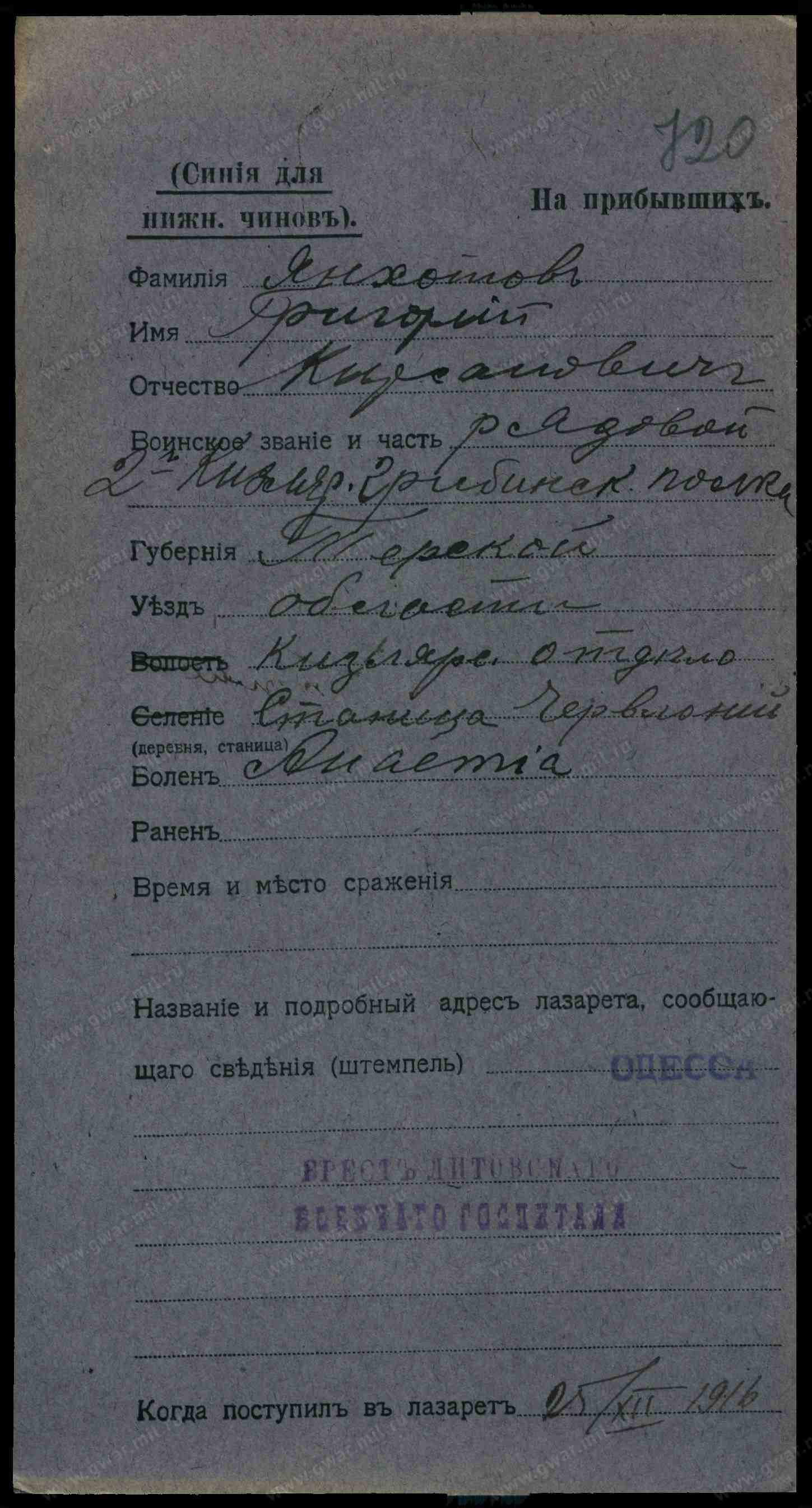 Мл. ур. Янхотов Дмитрий Анистифорович, старообр., женат, ст. Червленной Кизлярского отд. Терской обл., ранен 7 марта 1915, с. Зайдекан, лазарет с. Каракилисса, призван по мобилизации.