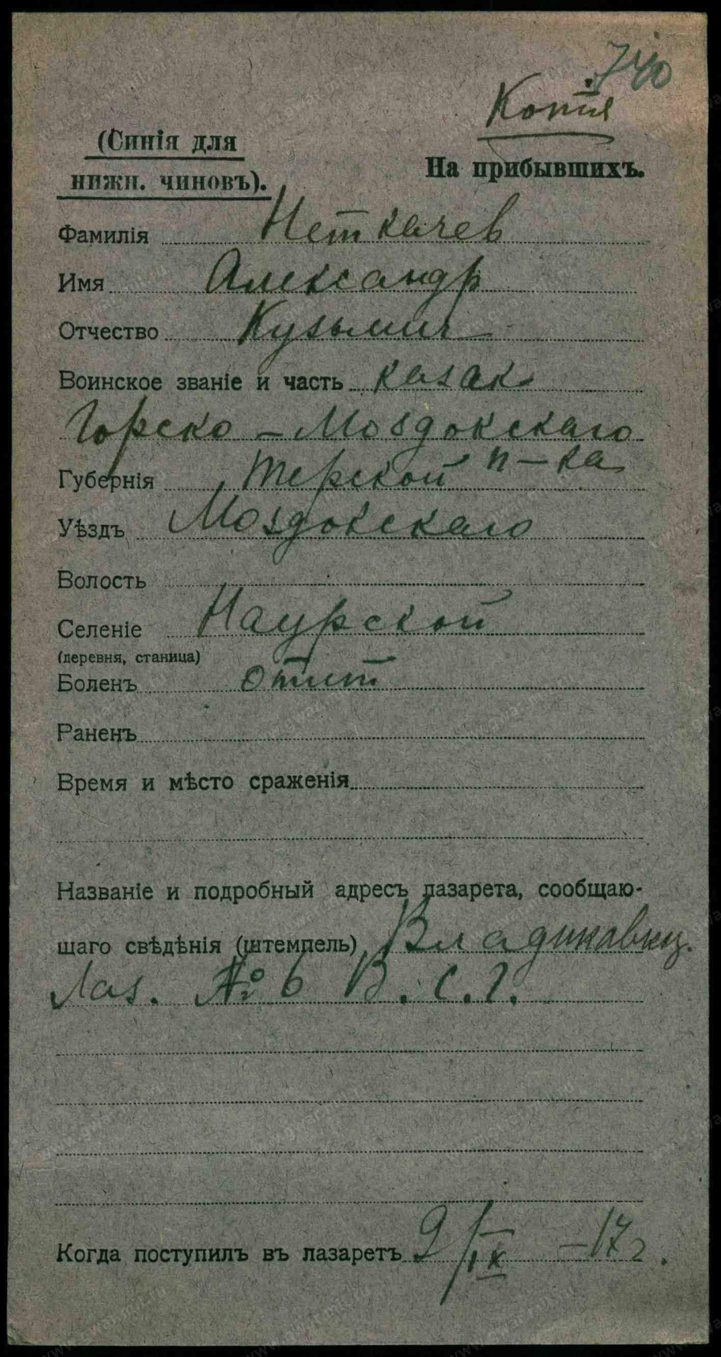 Место рождения Терская обл., Моздокский отдел, стнц. Наурская