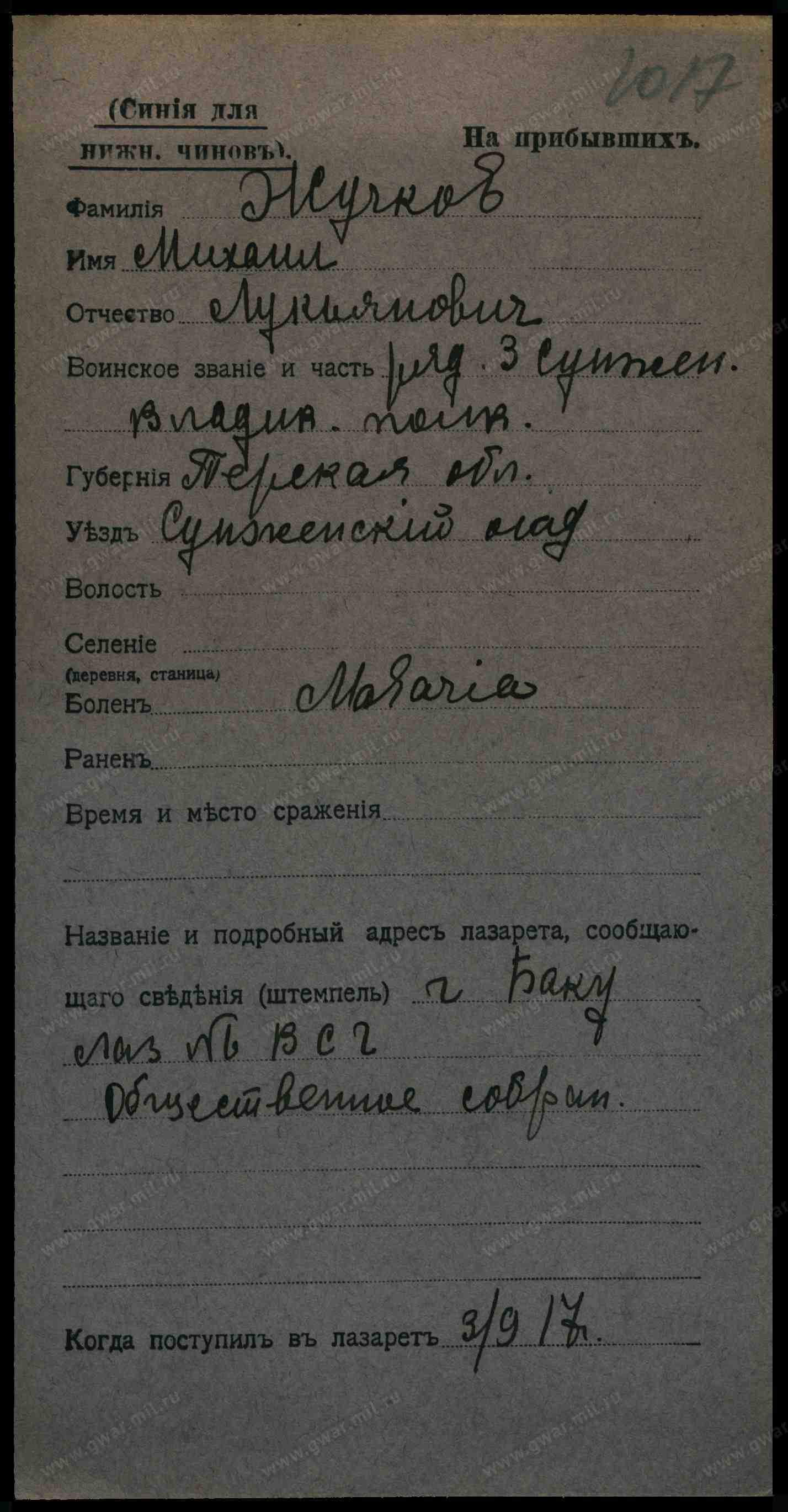 Место выбытия 192 полевой подвижной госпиталь, г. Станиславов