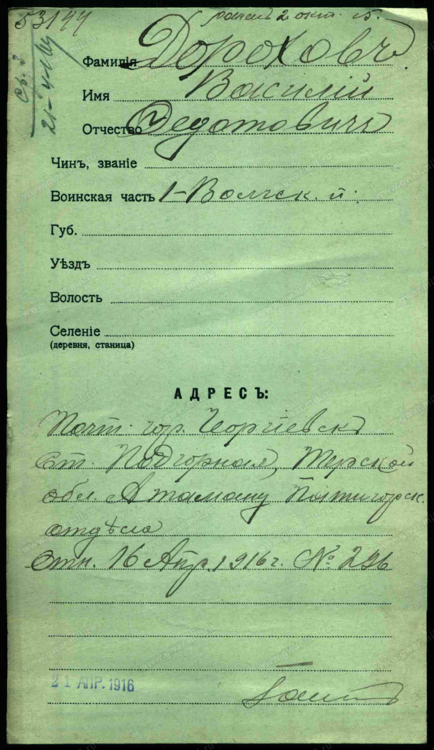 Каз. Дорохов Иван Егорович, 1-й Терский пеший бат., правос., женат, ст. Подгорной Пятигорского отд. Терской обл., ранен 7.07.1916, госпиталь.