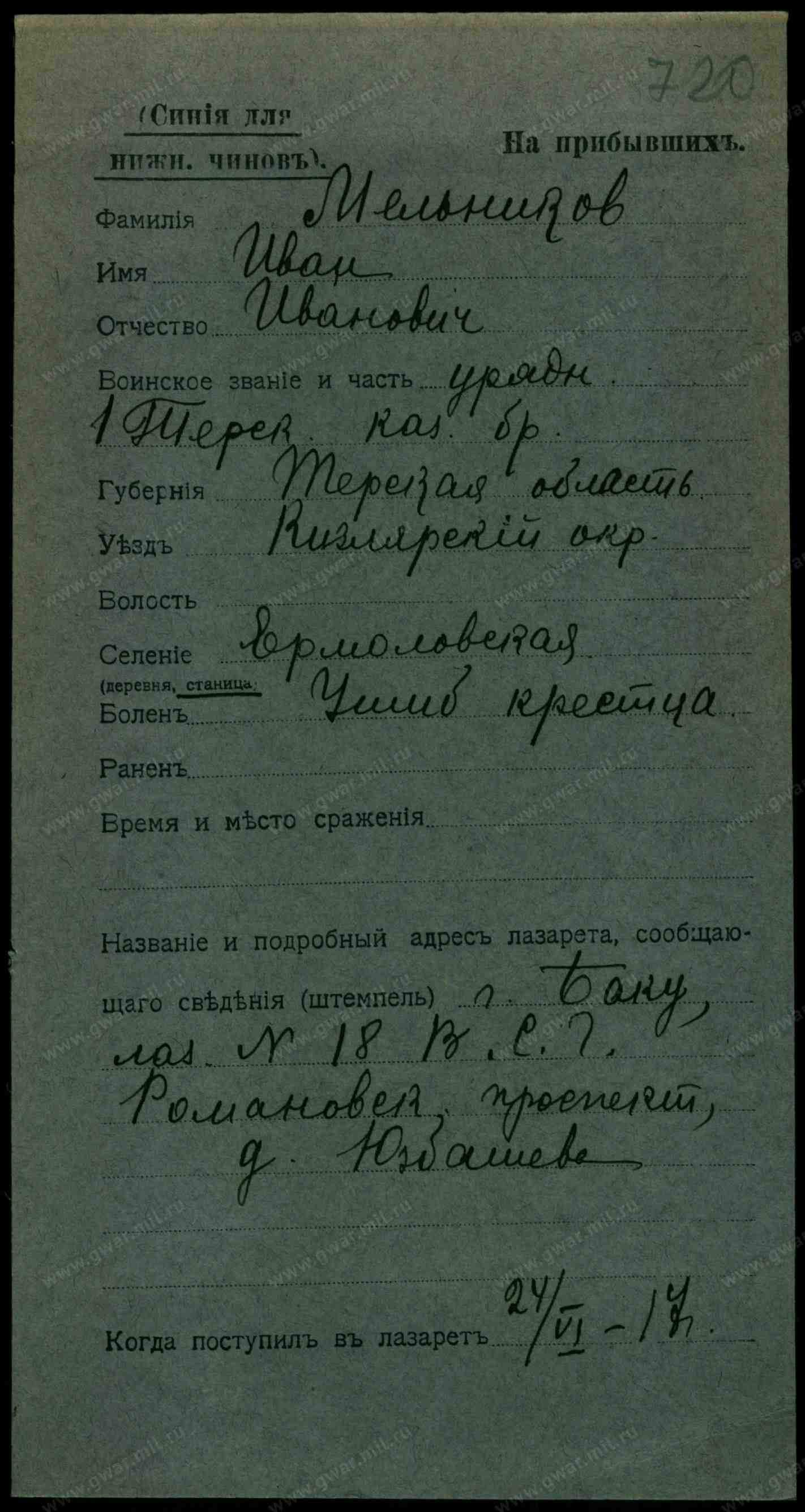 8 нояб. 1876. Внутренно-служащий казак ст. Алхан-Юртовской, Петр Мельников.