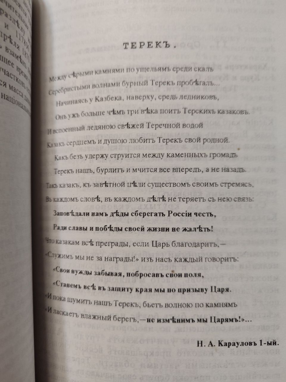 Н.А. Караулов 1-ый - автор стиха "Терек" (Между серыми камнями по ущельям среди скал...), опубликованного в работе М.А. Караулова 2-го "Терское казачество в прошлом и настоящем". В годы так называемого возрождения казачества этот текст был использован для создания гимна современного ТКВО. Пока не удалось выяснить, кто был инициатором этого выбора.