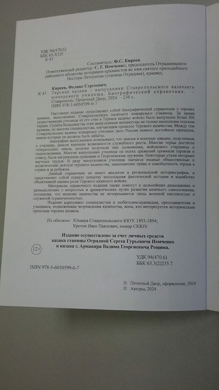 Терские казаки - выпускники Ставропольского юнкерского училища. Биографический справочник. Ставрополь: Печатный двор, 2024. - 236 с.
