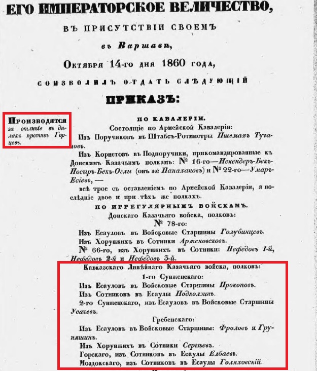 14. Сот. Егор Павлов Казыханов 40 (из черкес), в сл.каз. с 1823г. в Гор.каз.ком., с 1828г. в Гор.КП, женат, детей нет, в ст. Горской;