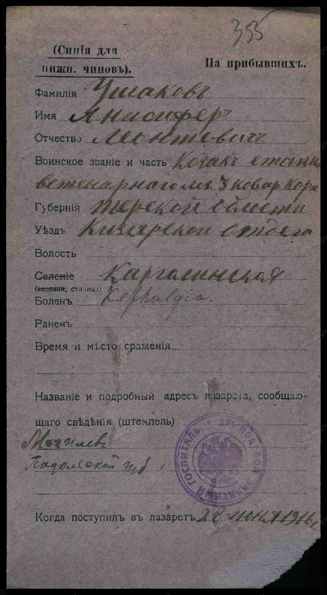 Каз. Ушаков Никита Львович, 6 сотня, старообрс., жен., ст. Каргалинской Терской обл., Кизлярского отд., ранен 30 апр. 1915, с. Жукоцин, госпиталь г. Станиславова.