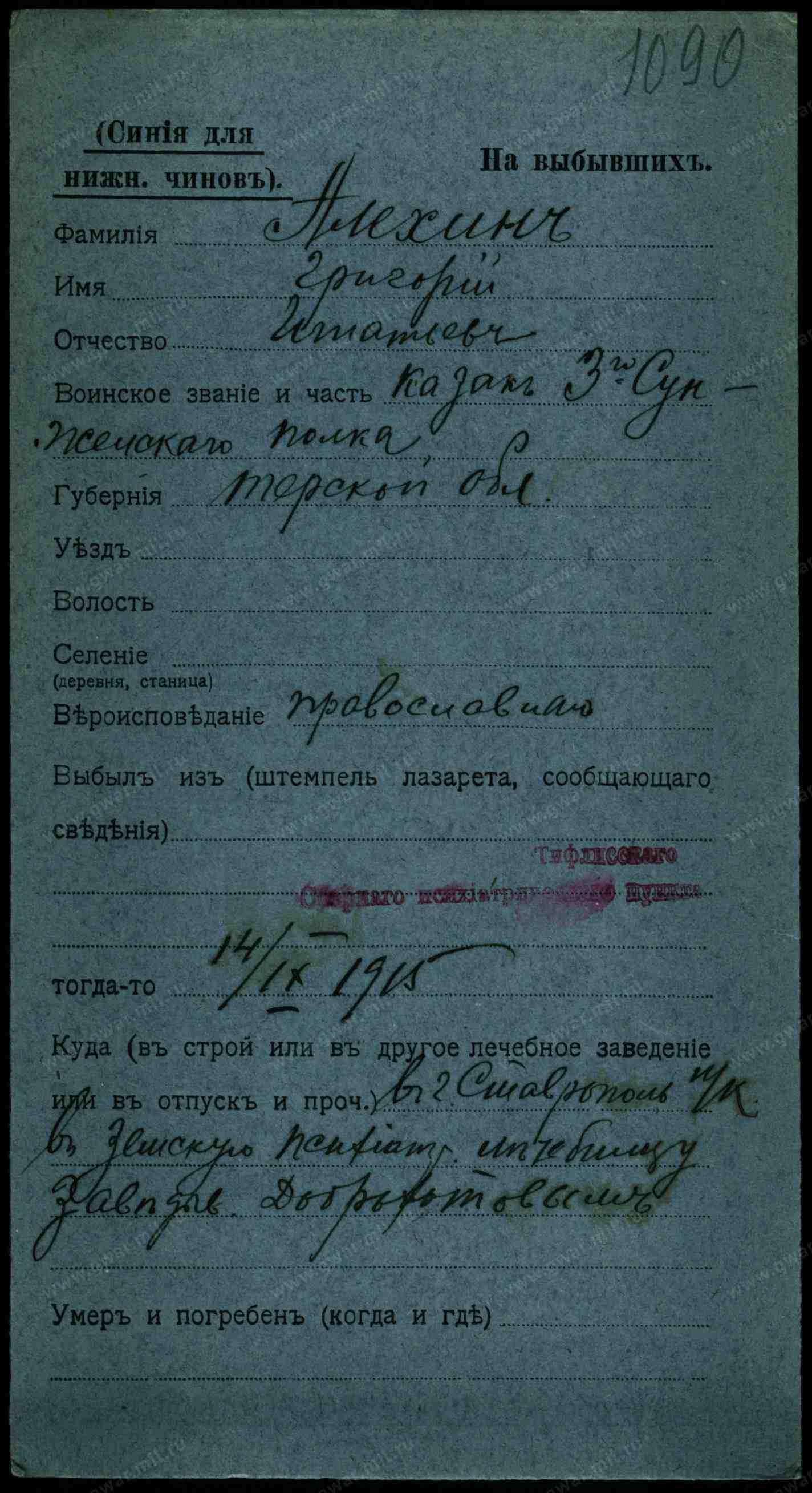 Место рождения: Терская обл., Место службы: 3-й Сунженско-Владикавказский полк Терского казачьего войска, казак