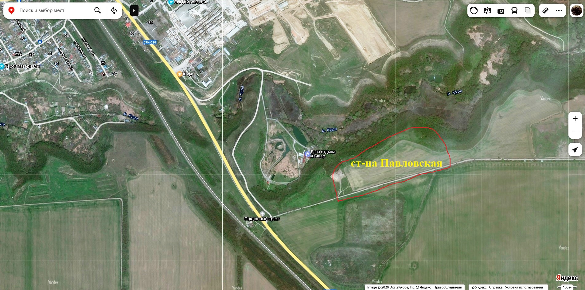 На рисунке с карты Яндекс указано примерное расположение бывшей ст-цы Павловской на правом берегу р.Кура рядом с бывшей крепостью Святого Павла,которая была основана на правом берегу р.Кура в 1777 году. Ст-цу Павловскую в середине 1820 годов начали переселять на левый берег р.Малка,ныне это ст-ца СТАРОПАВЛОВСКАЯ.
