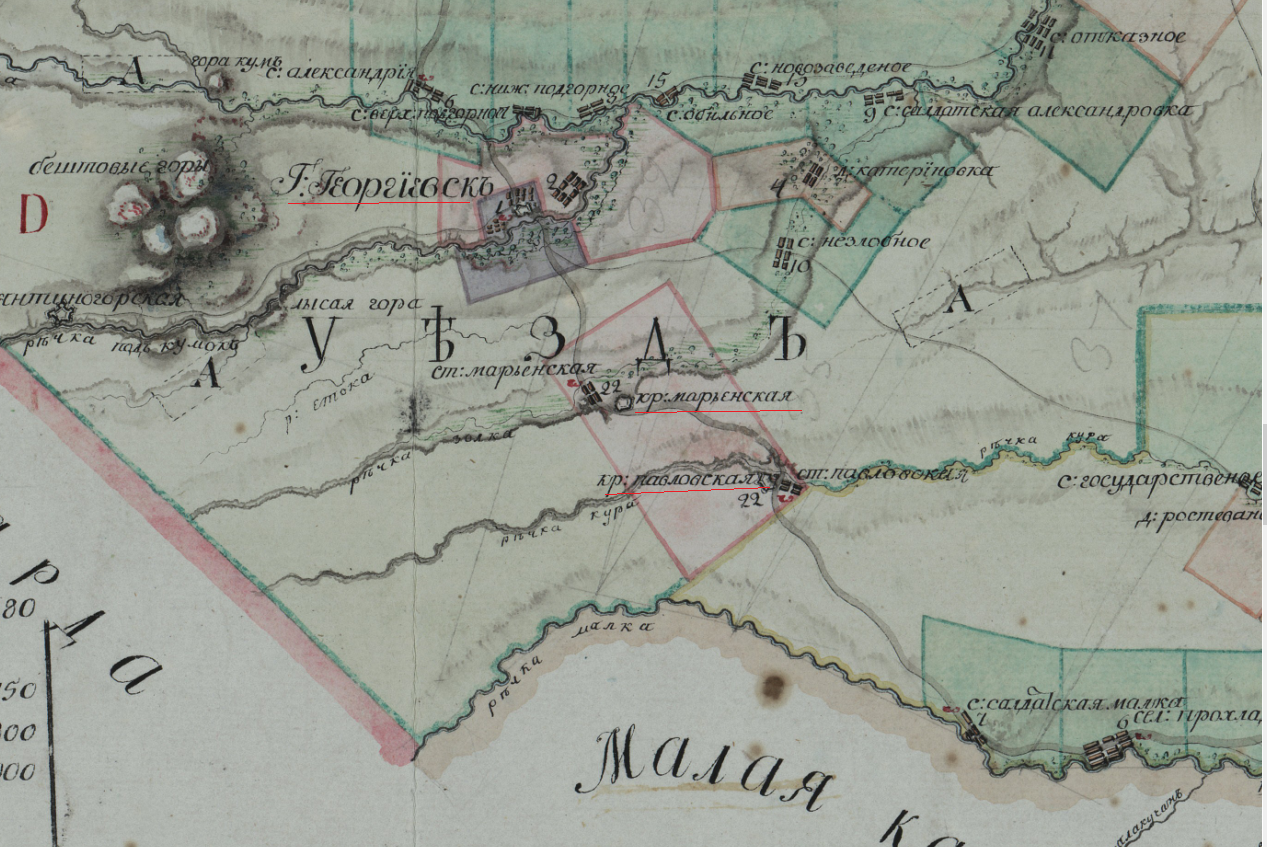На генеральной карте Кавказской губернии 1804 года указаны где были крепости Святой Марии и Святого Павла, а также указаны станицы Марьинская и Павловская