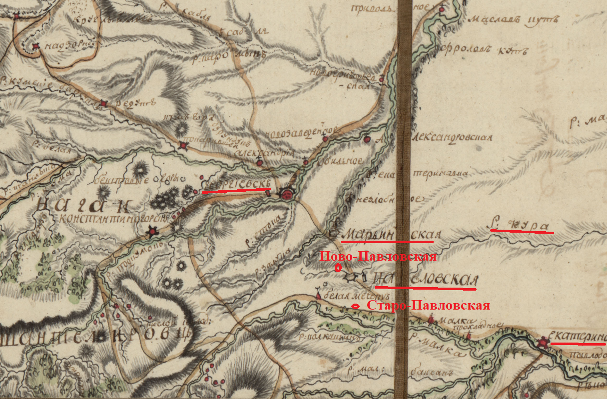 Карта 1871 года ,на которой указаны ст-цы: Павловская и Марьинская на р.Малка, Старопавловская на правом берегу реки Кура,а ст-ца Ново-Павловская на левом берегу р.Кура и была основана в 1848 году