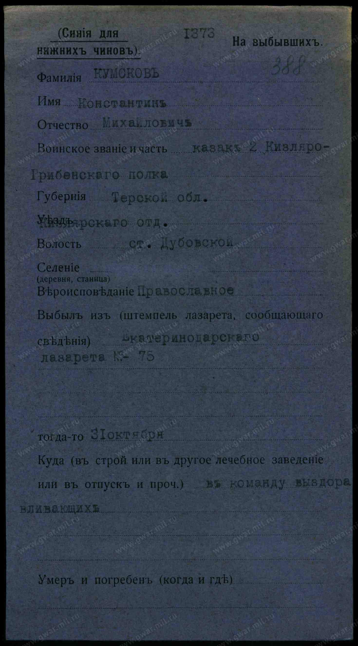 Каз. Кумсков Константин Михайлович, 6 сотня, правос., жен., ст. Дубовской, Терской обл., Кизлярского отд., ранен 25 авг. 1915, с. Хмелево, госпиталь м. Терембовля.