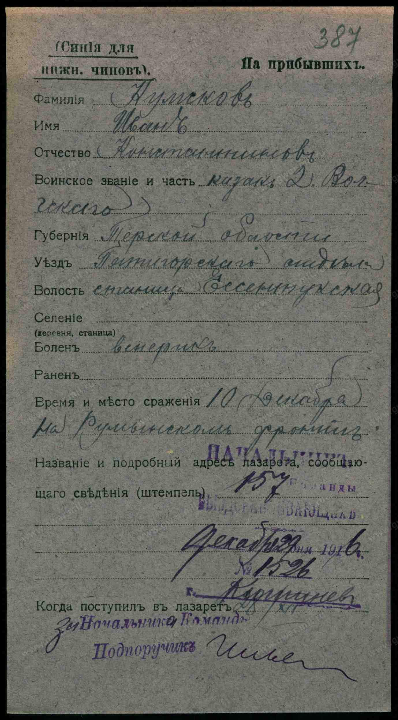 Рядовой, 21.05.1897 Орджоникидзевский край, г. Ессентуки. Донесение о потерях