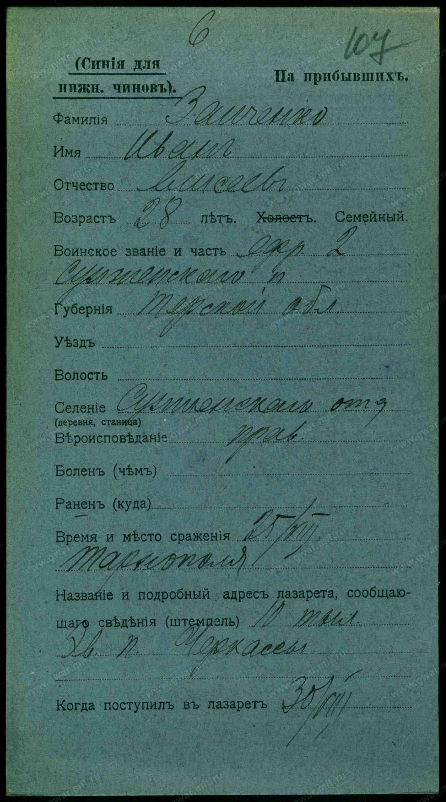казаку Елисею Заиченко – 4 ст. № 61205 (Ст. Котляревская)
