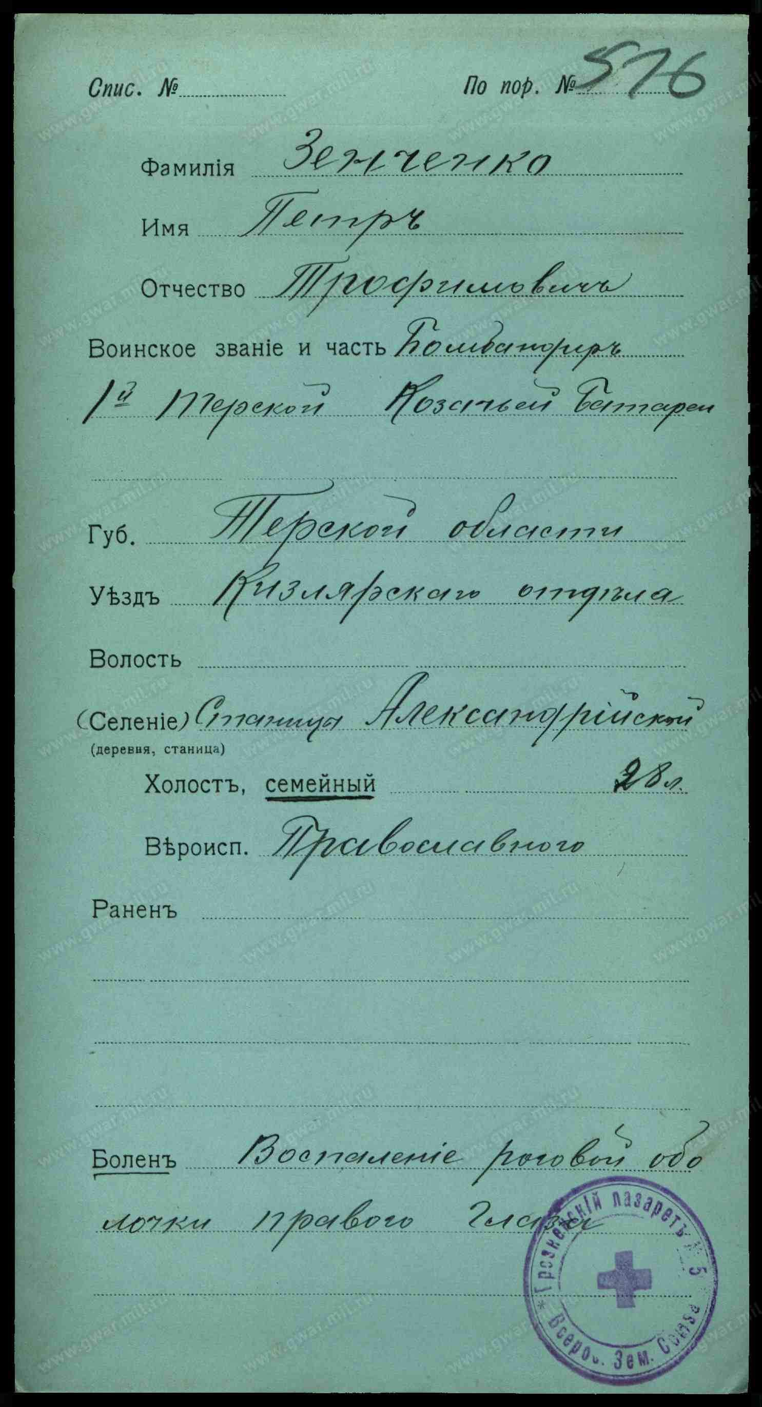 Ст. ур. Никифор Трофимович Зинченко, 4-я сотня, 1-го Кизляро-Гребенского Его Величества полка, станицы Александрийской, Кизлярского отдела, Терской обл., награжден 5.12.1916 ГК 2 ст. № 33440. [имеет 3 ст. № 11946, 4 ст. № 621000].