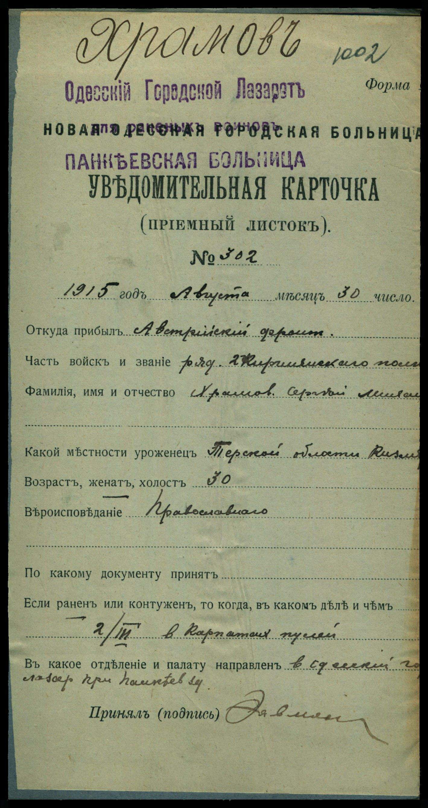 Каз. Храмов Сергей Михайлович, 2 сотня, правос., женат, ст. Савельевской Терской обл. Кизлярского отд. , ранен 2 марта 1915 с. Изержаны, госпиталь г. Станиславова.