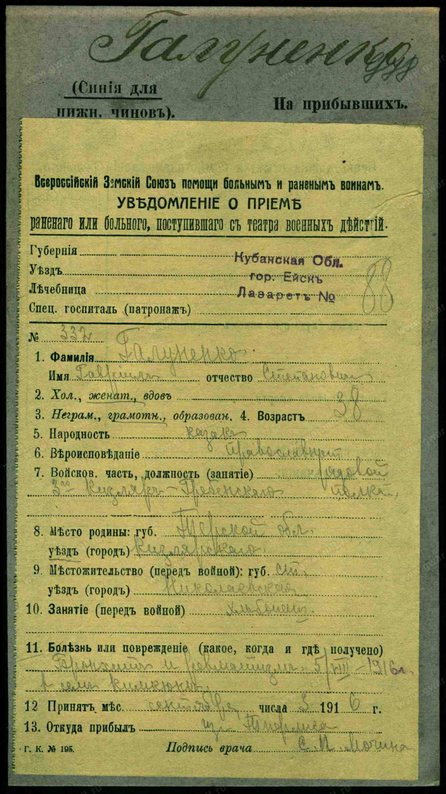 Прик. Голуненко Илларион Васильевич, 4 сотня, правос., жен., ст. Николаевской, Терской обл., Кизлярского отд., ранен 25 авг. 1915, с. Романовка, госпиталь м. Терембовля.
