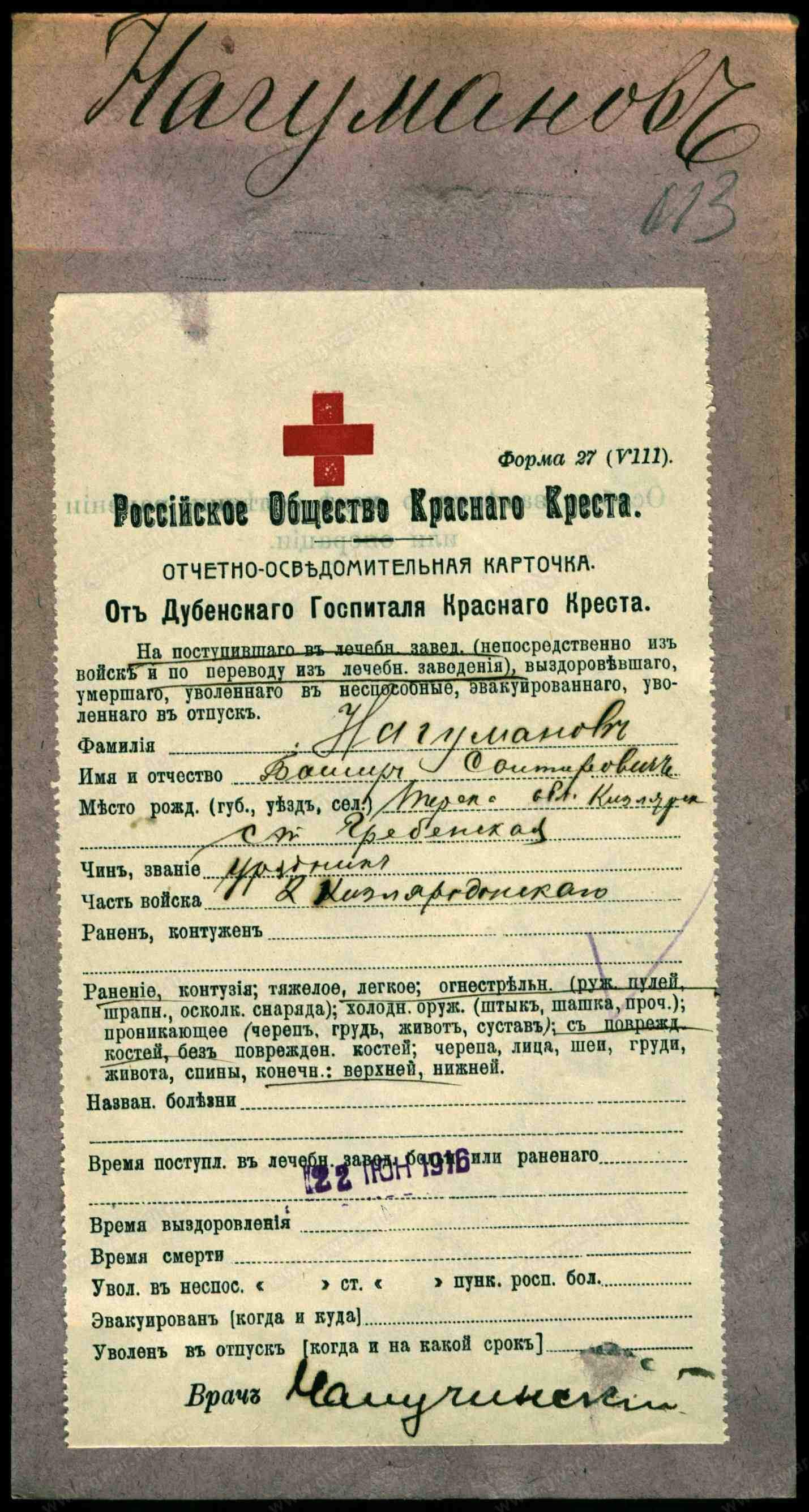 Мл. ур. Нагуманов Башир, 5 сотня, магом., жен., ст. Гребенской, Терской обл., Кизлярского отд., контужен 25 авг. 1915, с. Романовка, ост. в строю.
