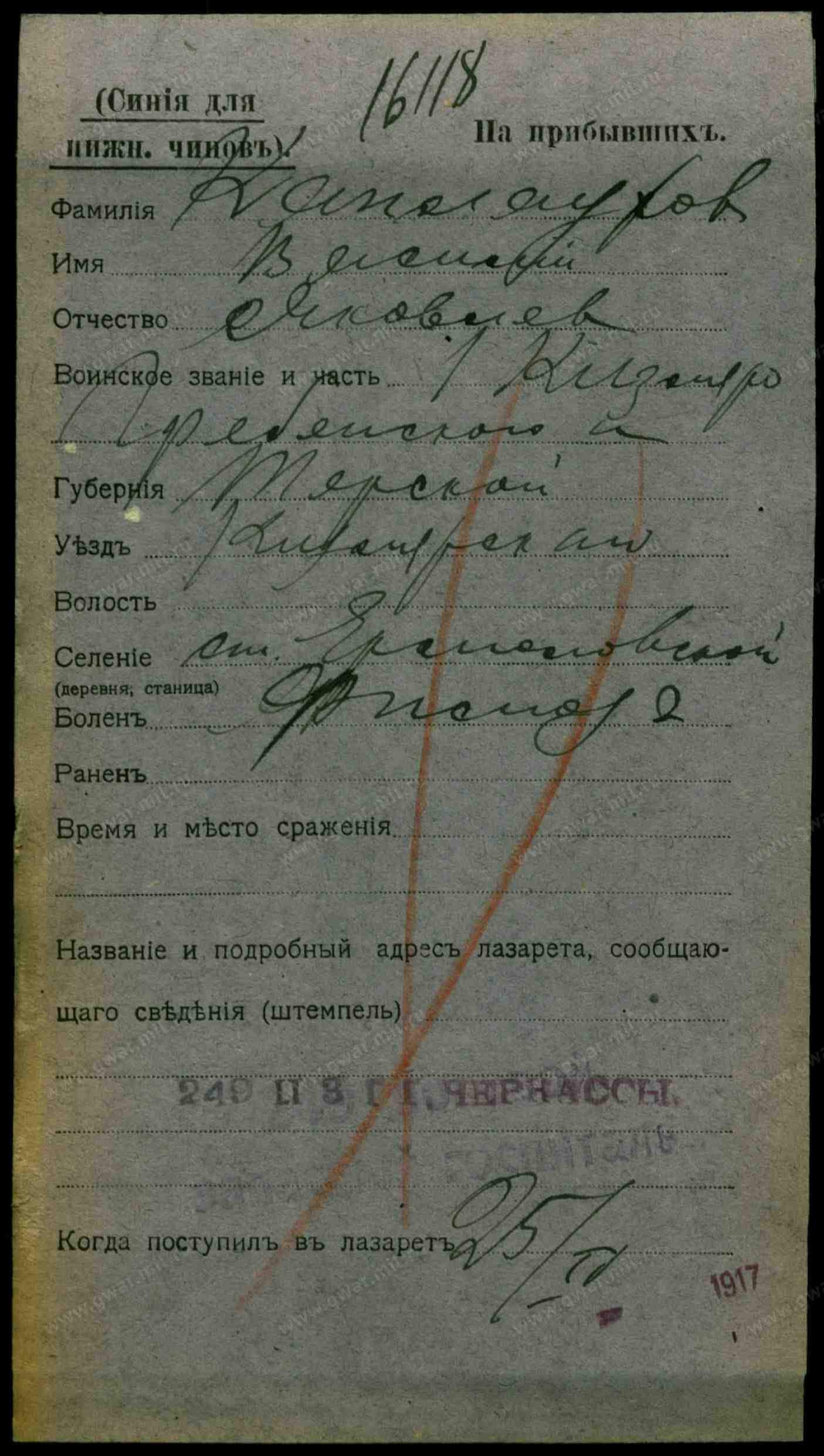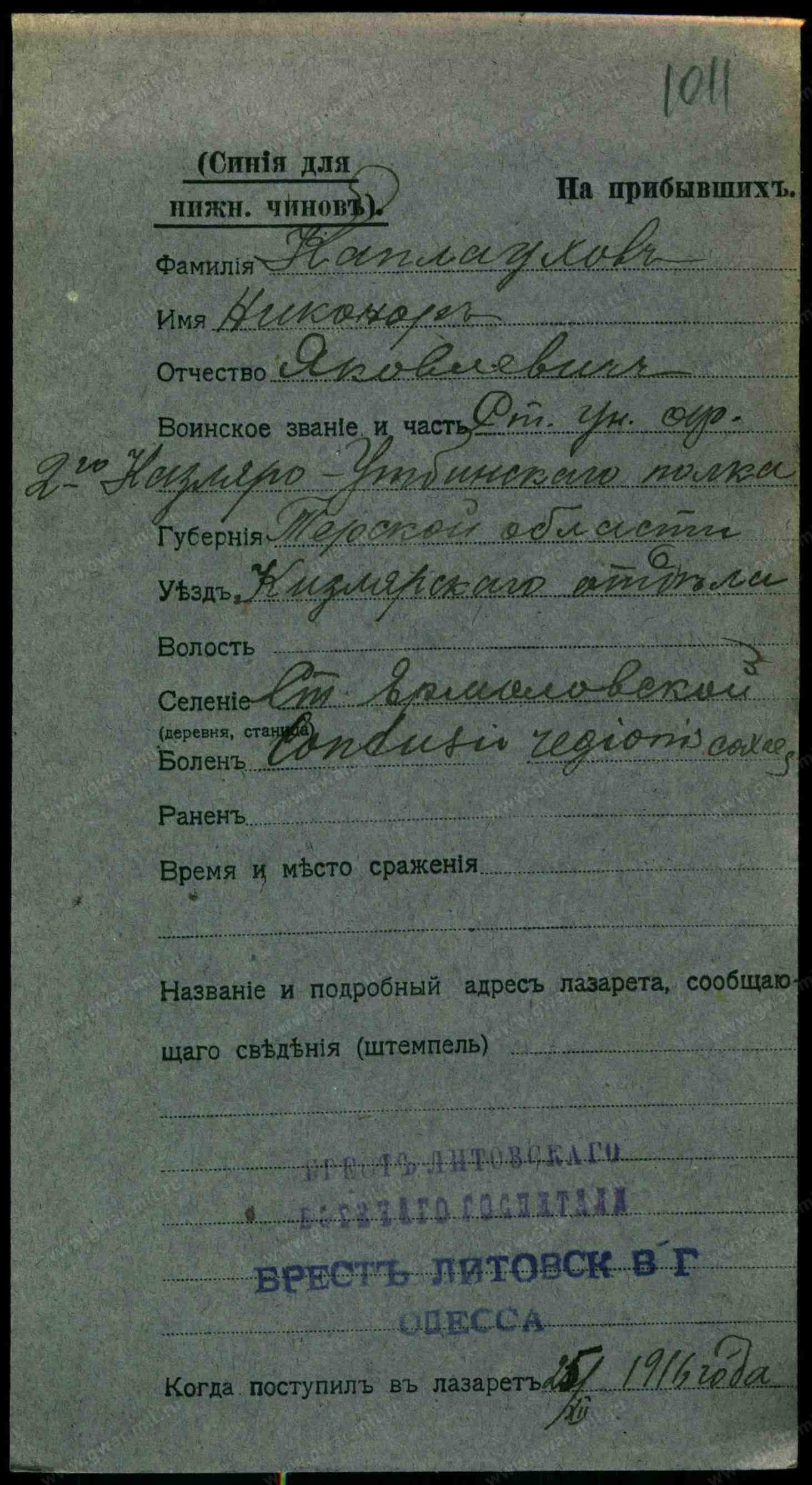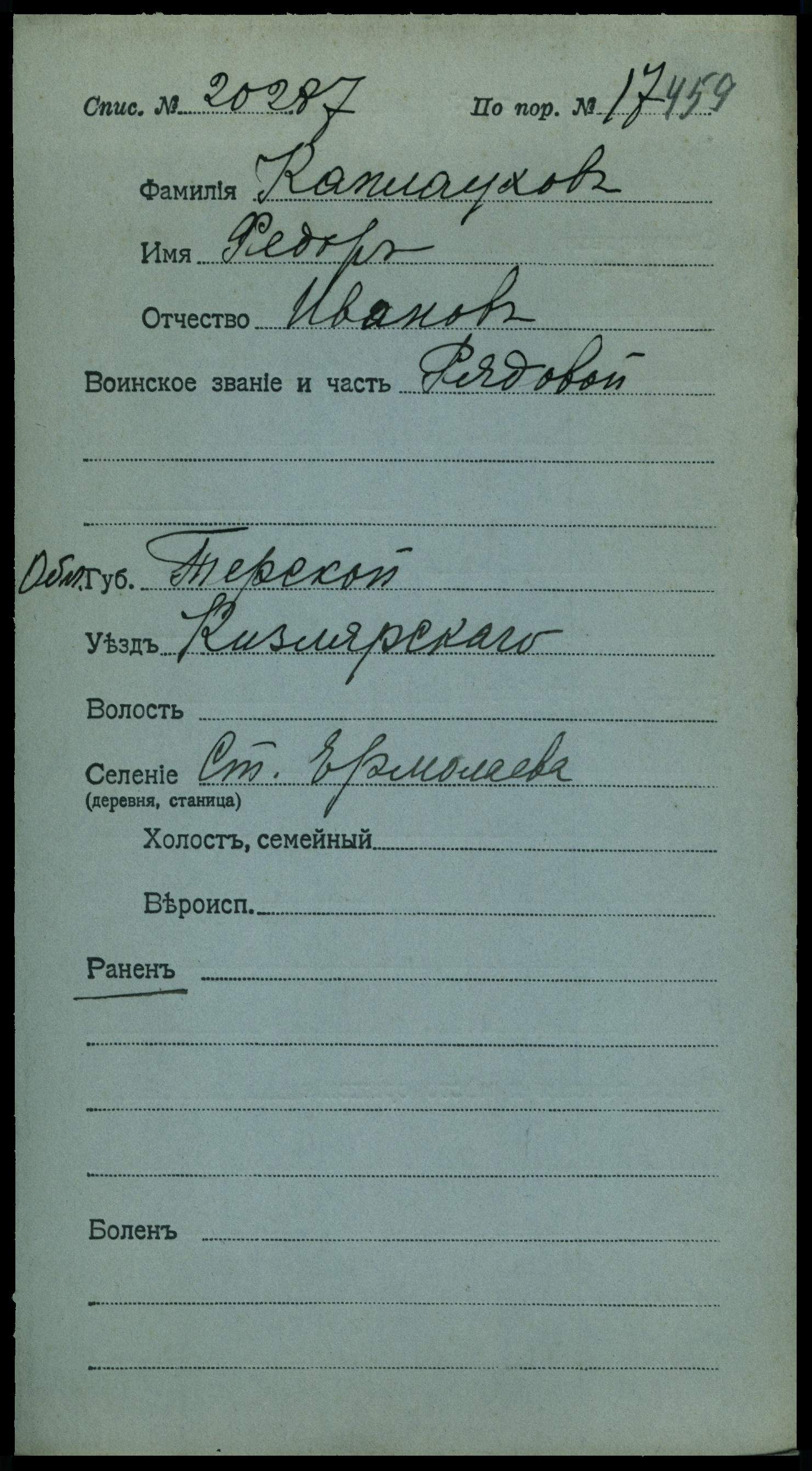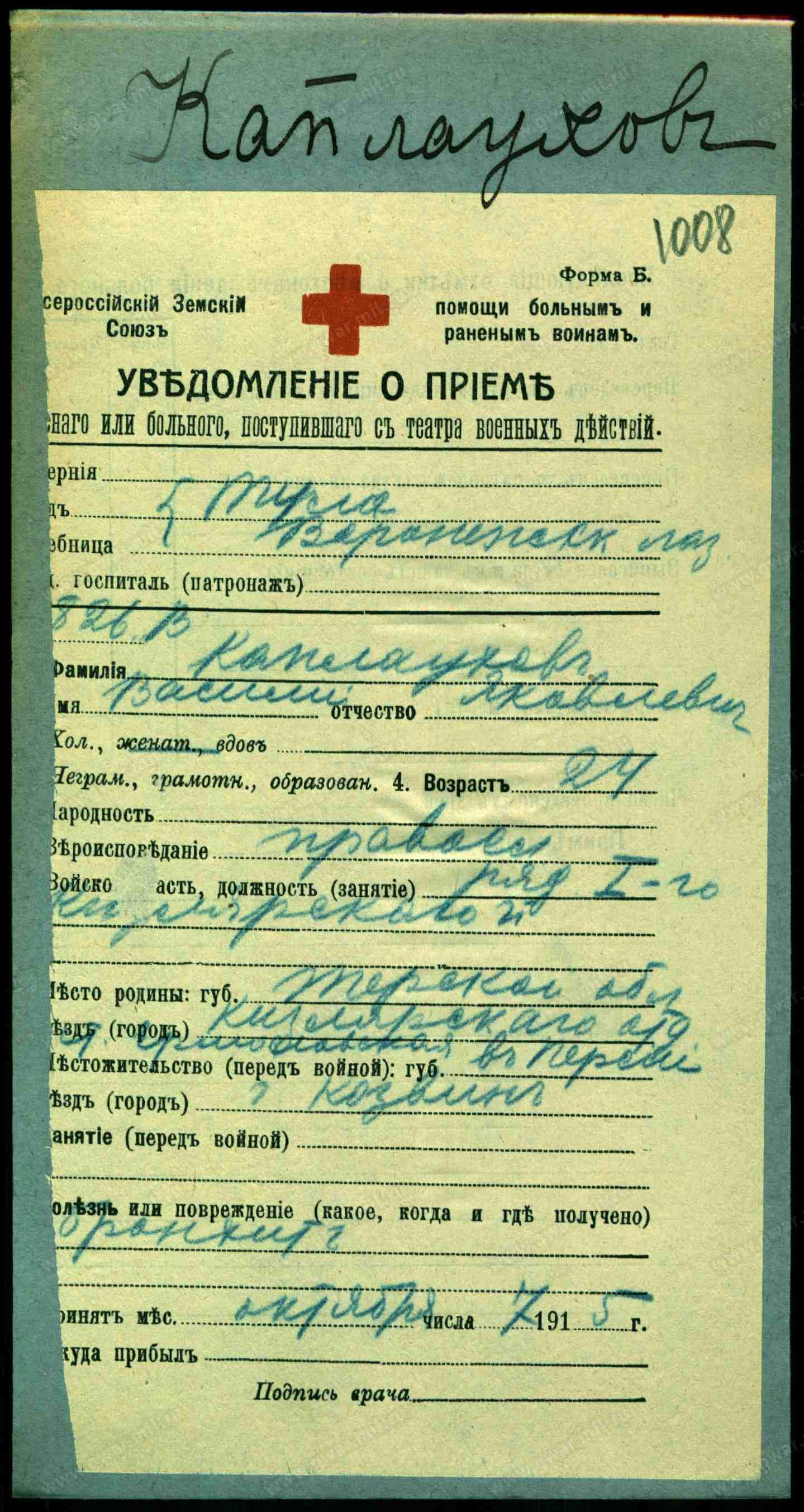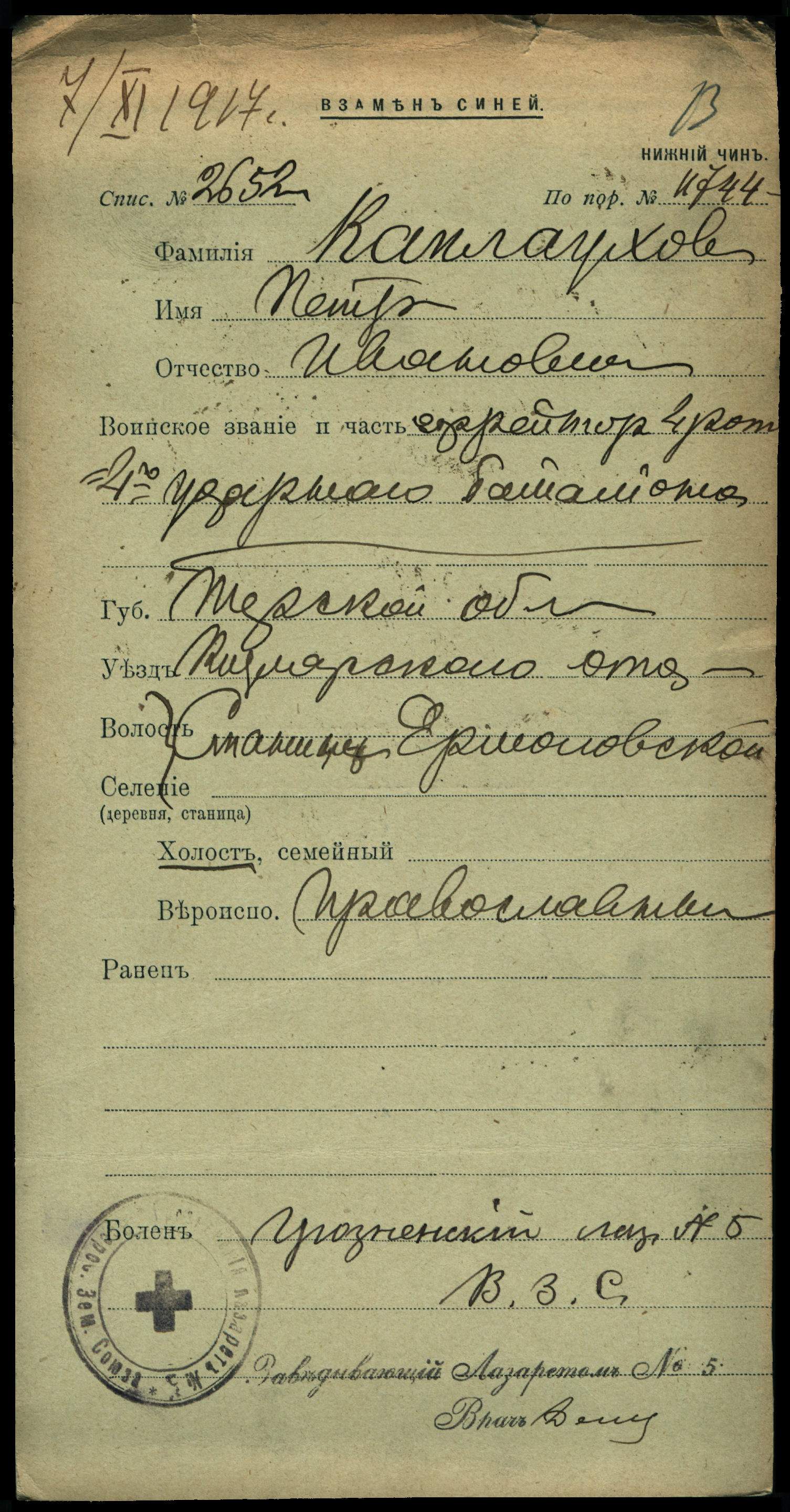 Каз. Каплаухов Федор Иванович, правос., женат, ст. Ермоловской Кизлярского отд. Терской обл., ранен 7 марта 1915, с. Зайдекан, лазарет с. Каракилисса, призван по мобилизации.