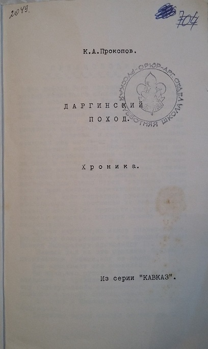 К. А. Прокопов. Даргинский поход. Хроника. Из серии «Кавказ» (без указания места и года издания). 40 с.